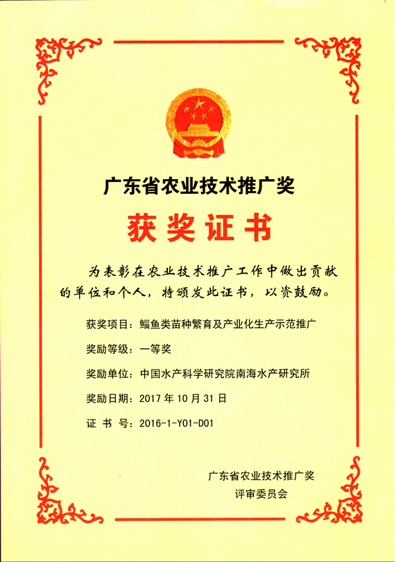近日,广东省农业技术推广奖评审委员会对2017年评审的2016年度广东省农业技术推广奖获奖项目颁发证书,其中一等奖11项、二等奖36项、三等奖44项。中国水产科学研究院南海水产研究所区又君研究员主持完成的“鲻鱼类苗种繁育及产业化生产示范推广”项目荣获广东省农业技术推广奖一等奖并获荣誉证书?/p>