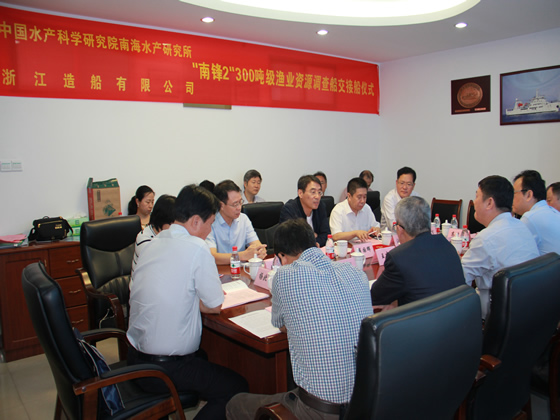 交船活动中,江世贵所长对各位领导、各位来宾的莅临表示热烈欢迎和衷心感谢,并在介绍“南锋”号调查船近年充分发挥重要科研平台作用的基础上,表示今后将进一步加强与部、院、地方业务主管部门的沟通交流,把“南?”号和“南锋”号一并管理好、使用好,打造成为我国渔业资源养护、管理及可持续利用的重要科学平台、科研教学共享共用平台和人才培养平台,为促进海洋生态文明建设、加快我国从渔业大国向渔业强国转变做出应有的贡献。崔国辉副院长对“南?”号调查船交付使用表示祝贺,强调指出全院4?00吨级渔业资源调查船顺利收官的重要意义,并围绕服务国家海洋强国战略、推进生态文明建设、加快现代渔业建设等方面对尽快发挥渔业资源调查船的最大效益和作用提出了殷切希望和明确要求?/P>