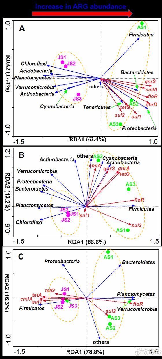 该创新团队此前还跟踪分析了珠三角地区半集约化对虾养殖环境中ARGs的分布特征,发现养殖水源水是ARGs的重要来源。相关研究成果以论文“Occurrence and temporal resistance genes (ARGs) in shrimp aquaculture: ARGs dissemination from farming source to reared organisms”发表在《Science of the Total Environment》上(IF=4.900, 2017)?nbsp;