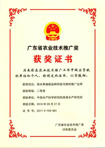 近日,中国水产科学研究院南海水产研究所区又君研究员主持完成的《海水养殖新品种四指马鲅的推广应用》成果获得广东省农业技术推广奖评审委员会颁发的广东省农业技术推广奖二等奖证书?/p>