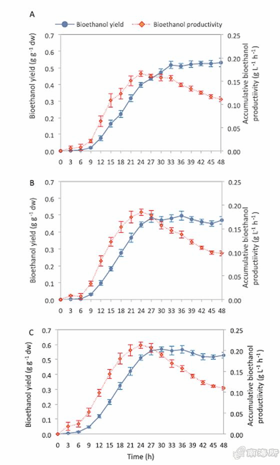图示斜生栅藻在人工废水(A)中、脂质提取后的斜生栅藻在人工废水(B)中以及脂质提取后的斜生栅藻在添加废甘油的人工废水(C)中的生物乙醇产量与产率的时间变化?/p>