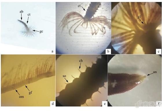 ab.腹区;ct.胸区;gc.鳃冠;gl.鳃叶;gf.鳃丝;om.复眼;ch.刚毛;so.刚节;an.肛门