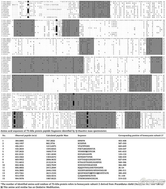 虾、蟹等十足目甲壳类动物在加热熟制时,其甲壳颜色会转变成橘红色。明亮的颜色不仅反映了其新鲜程度,同时也刺激了人们的购买欲望。该研究从克氏原螯虾甲壳中获得了两种分子量分别为24 kDa?3 kDa的水溶性红变相关蛋白,其初始红变温度为30 ℃,加热?0 ℃发生不可逆变性并产生大量红色沉淀。质谱分析结果显示,这两种蛋白均属于血蓝蛋白家族,其中24 kDa蛋白为单体结构,?3 kDa蛋白是其三聚体。实验表明,甲壳中获得的血蓝蛋白具有结合色素并参与甲壳加热红变的新功能。该研究为在加工过程中有效促进甲壳红变、提高甲壳类水产食品的商品价值提供了重要理论支撑?/p>