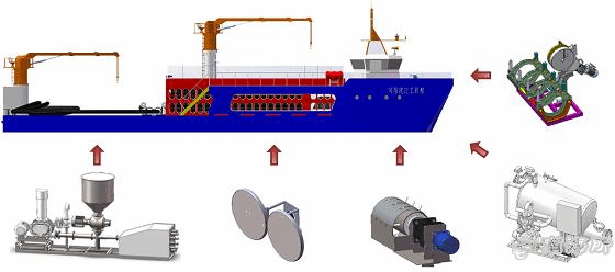 注:配套装备从左往右依次为:远程自动投饵机、高效节能洗网机、机械辅助起网机、无损吸鱼泵和机械化焊机