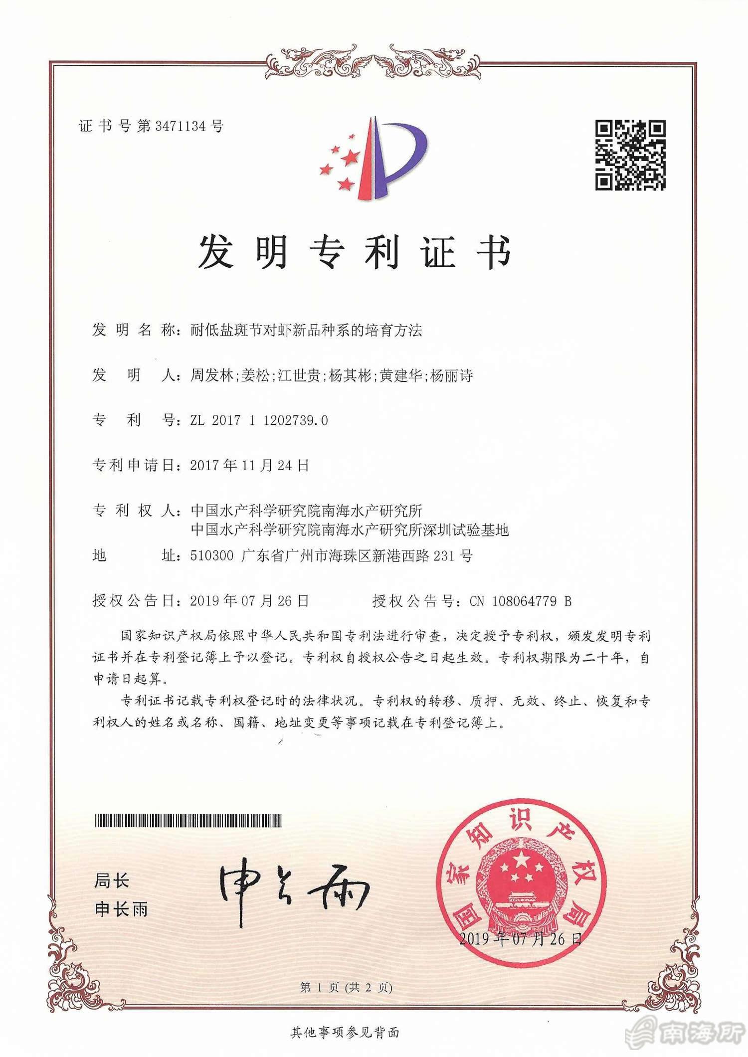 南海所“耐低盐斑节对虾新品种系的培育方法”获国家发明专利授权