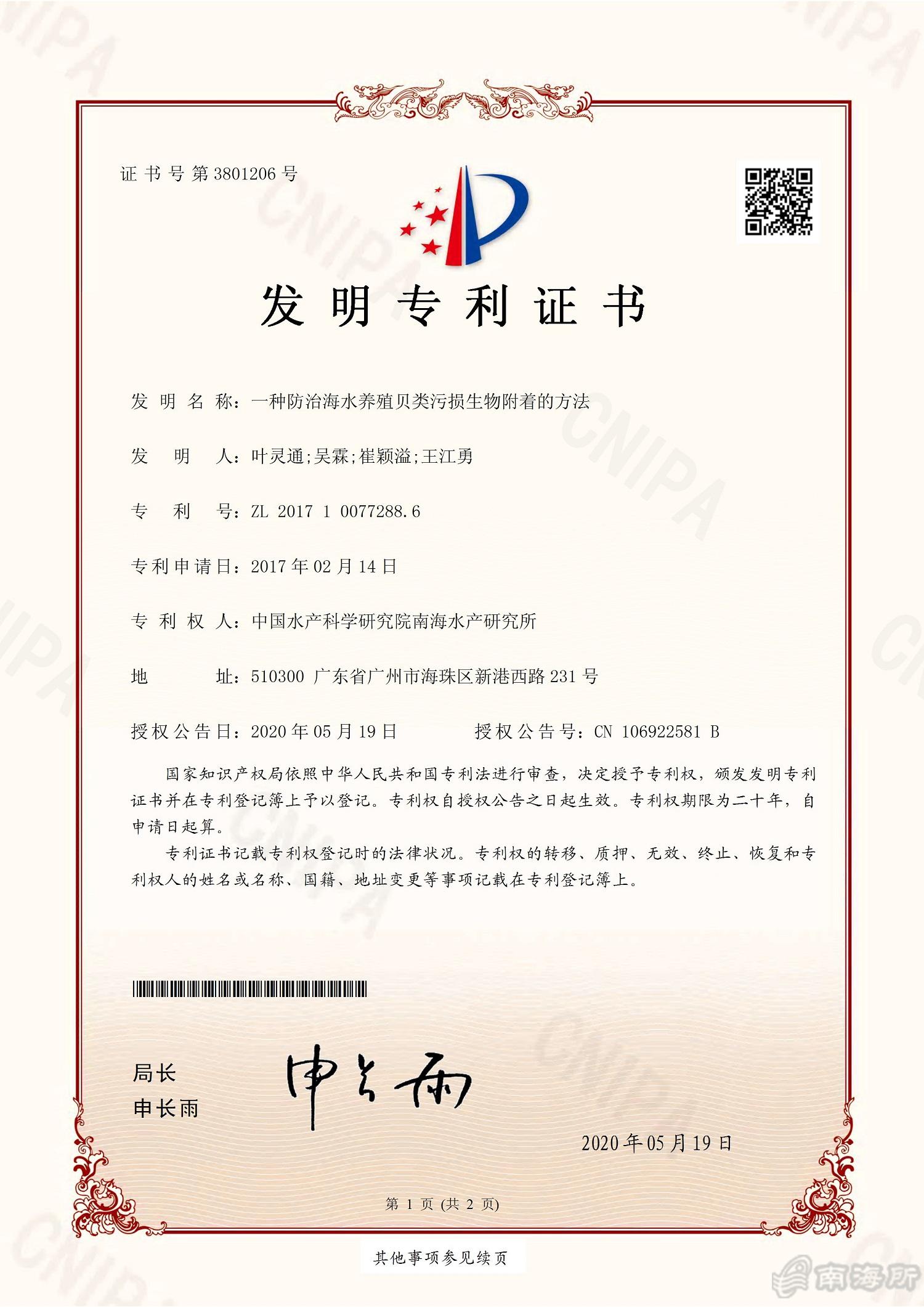南海所“一种防治海水养殖贝类污损生物附着的方法”获国家发明专利授权