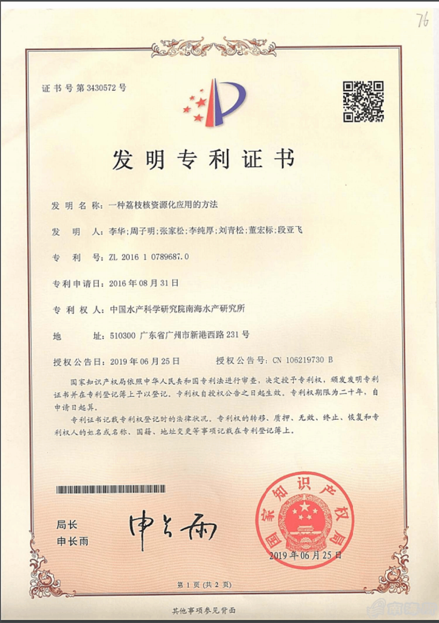 日前,由中国水产科学研究院南海水产研究所李华等发明的“一种荔枝核资源化应用的方法”获得国家发明专利授权,专利号为ZL201610789687.0。该发明的一种荔枝核资源化应用方法,针对占荔枝核干重50%以上的淀粉加以应用,是荔枝资源综合利用的一种有效途径?/p>