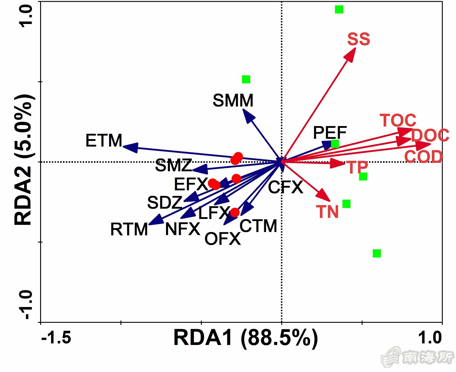 池塘水中抗生素浓度与环境因子的RDA分析