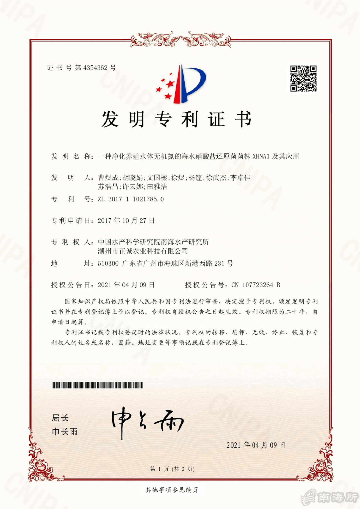 南海所“一种净化养殖水体无机氮的海水硝酸盐还原菌菌株XHNA1及其应用”获国家发明专利授权
