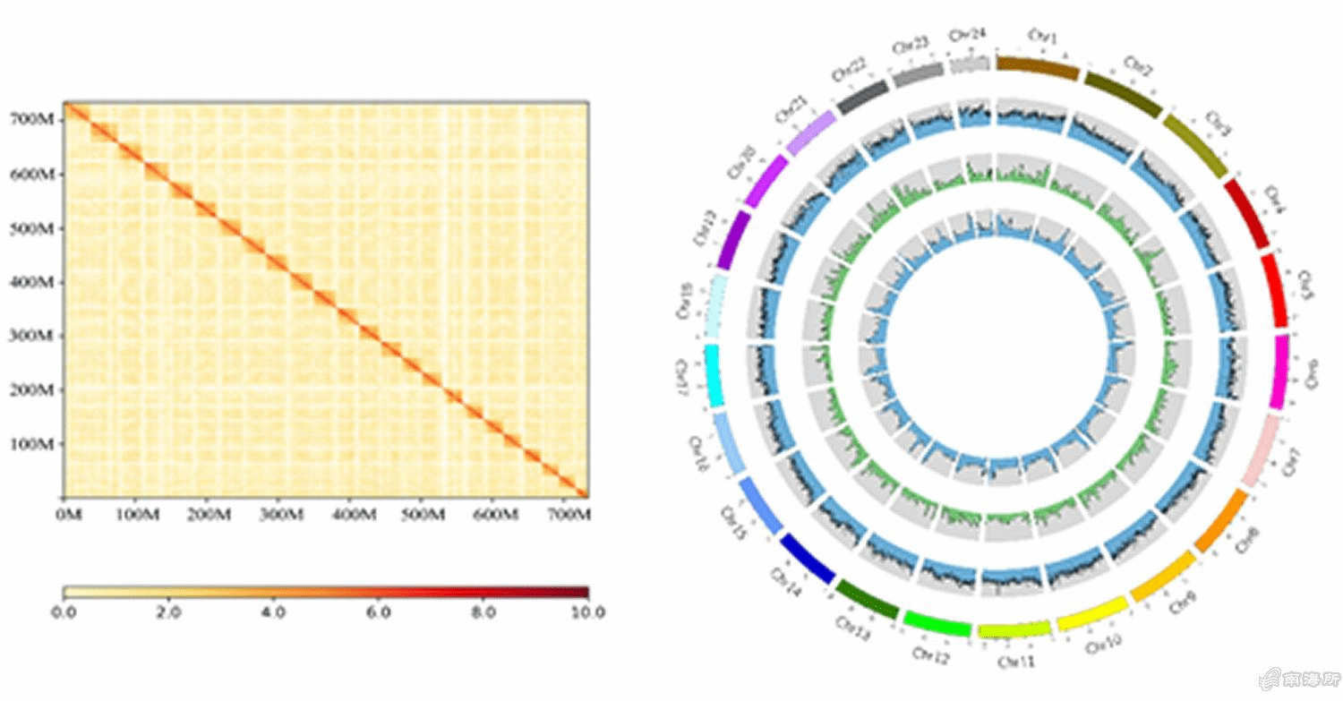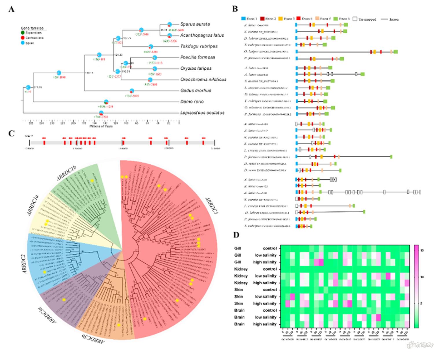 张殿昌研究员团队利用第二、三代测序和Hi-C染色体构象捕获技术,构建了黄鳍棘鲷染色体水平的基因组图谱,其基因组大小为806Mb,contig N50和scaffold N50分别达到2.60 Mb?0.2 Mb,利用Hi-C技术成功将90.8%的组装序列挂载到24条染色体上,鉴定?9,631蛋白编码基因,基因家族分析显示ARRDC3 ?GSTA基因家族在广盐性的鲷科鱼类中出现了大量扩张,为后续研究鲷科鱼类渗透压调节机制提供了重要参考?/p>