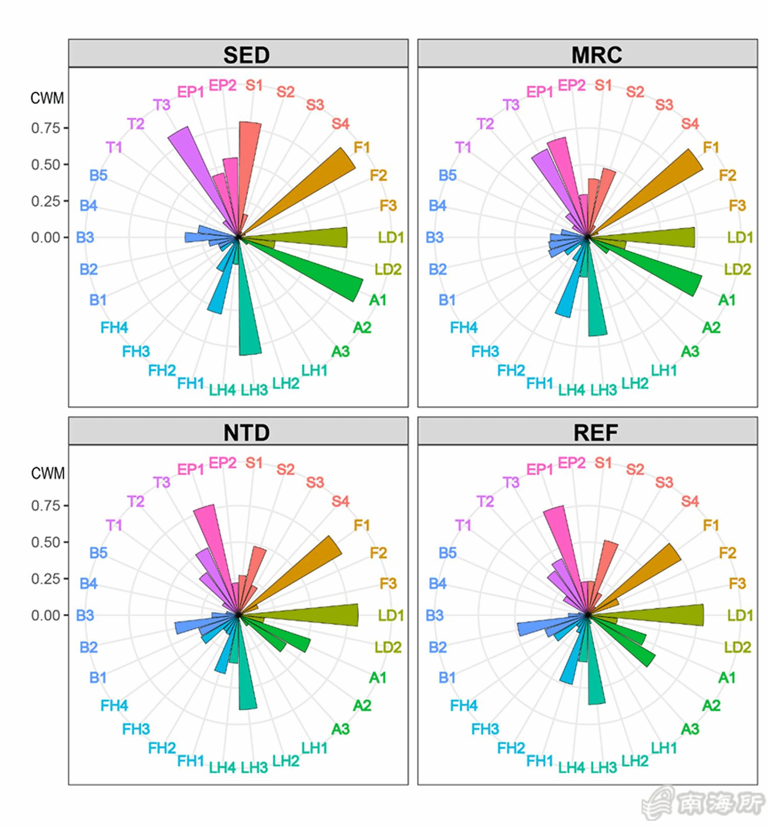 不同人类活动类型影响下的大型底栖生物群落功能性状组成(SED,污水排放区;MRC,海水养殖区;NTD,温排水区;REF,对照区?/span>