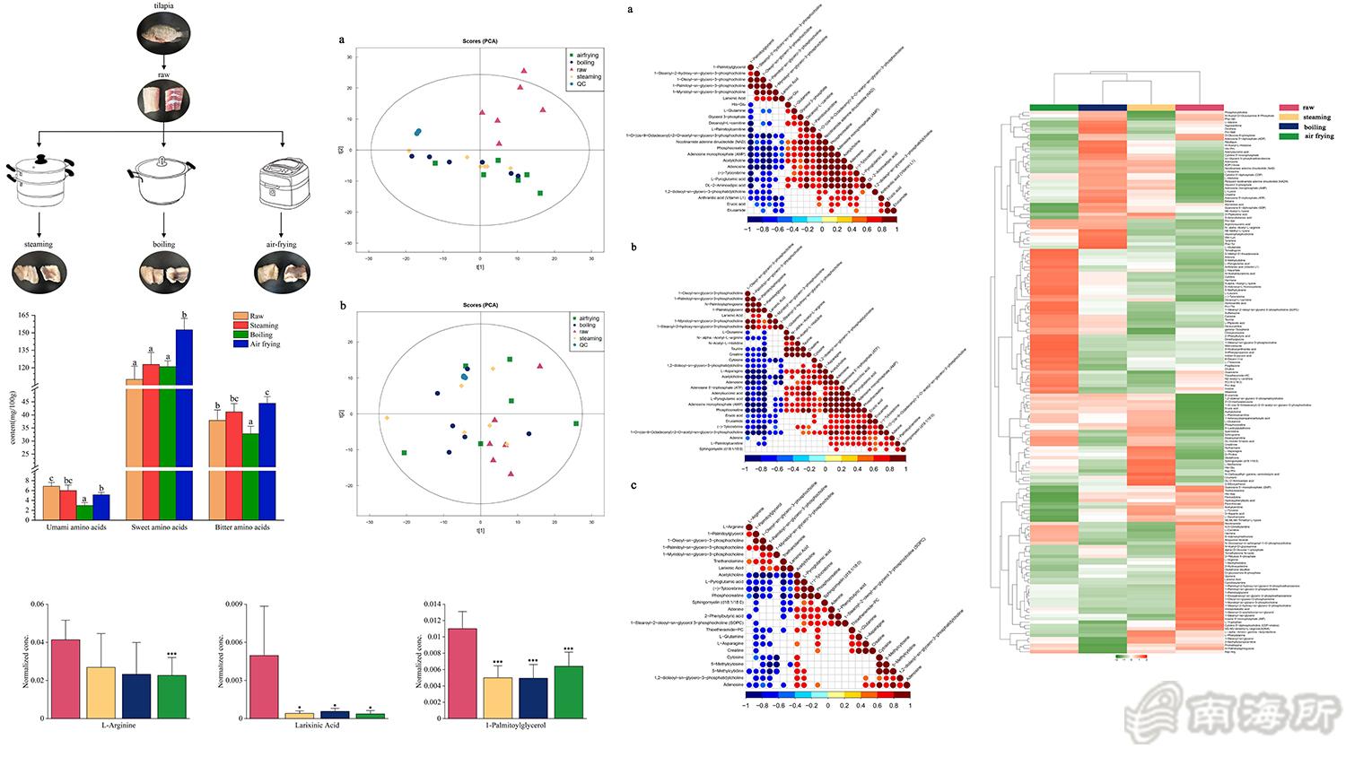 热加工是罗非鱼常用的加工方法,对鱼肉的品质有重要影响,鱼肉生肉和熟肉中的一些非挥发性物质(如氨基酸类、维生素类、核苷类、有机酸类、脂质类等)不但决定着肉质的滋味,同时也承担着一定的营养功能。南海所创新团队以新鲜罗非鱼片和经过汽蒸、水煮、空气炸加工处理的罗非鱼片为研究对象,借助UHPLC-Q-TOF-MS/MS代谢组学方法来识别和筛选差异代谢物,定性分析了经热加工处理后罗非鱼片代谢物的变化,发现氨基酸类、核苷酸类可作为判定汽蒸、水煮和空气炸处理罗非鱼片特征风味和营养特性的重要指标;在此基础上,借助HPLC法定量分析了新鲜生样、汽蒸、水煮和空气炸加工处理罗非鱼片中游离氨基酸和核苷酸的组成,结合多相靶标分析策略分析滋味强度(TAV)和味精当量(EUC),从而获取游离氨基酸和呈味核苷酸对不同加工方式罗非鱼片整体滋味的影响?/p>
