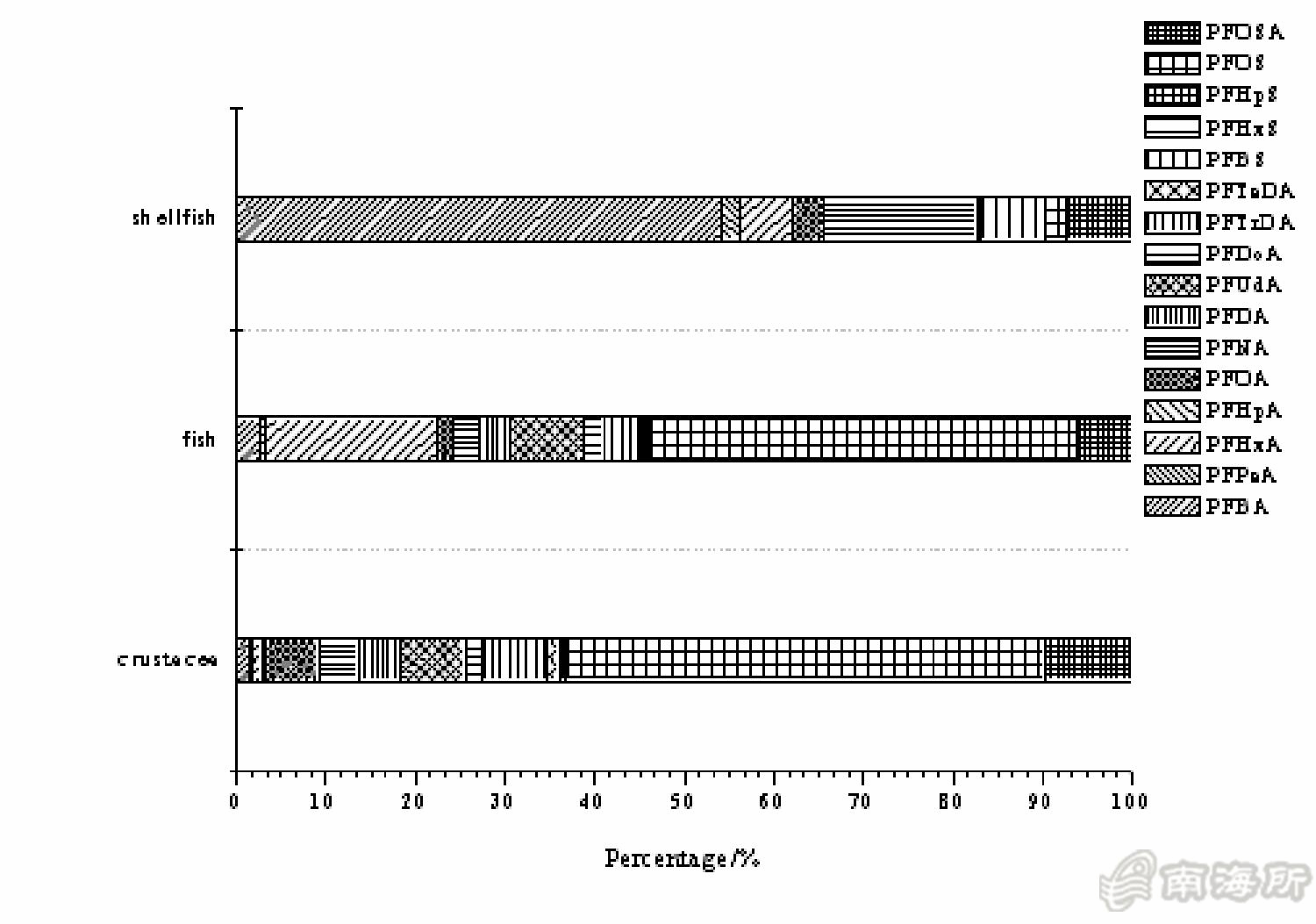 鱼类、贝类和甲壳类样品中PFASs组分的污染贡献率
