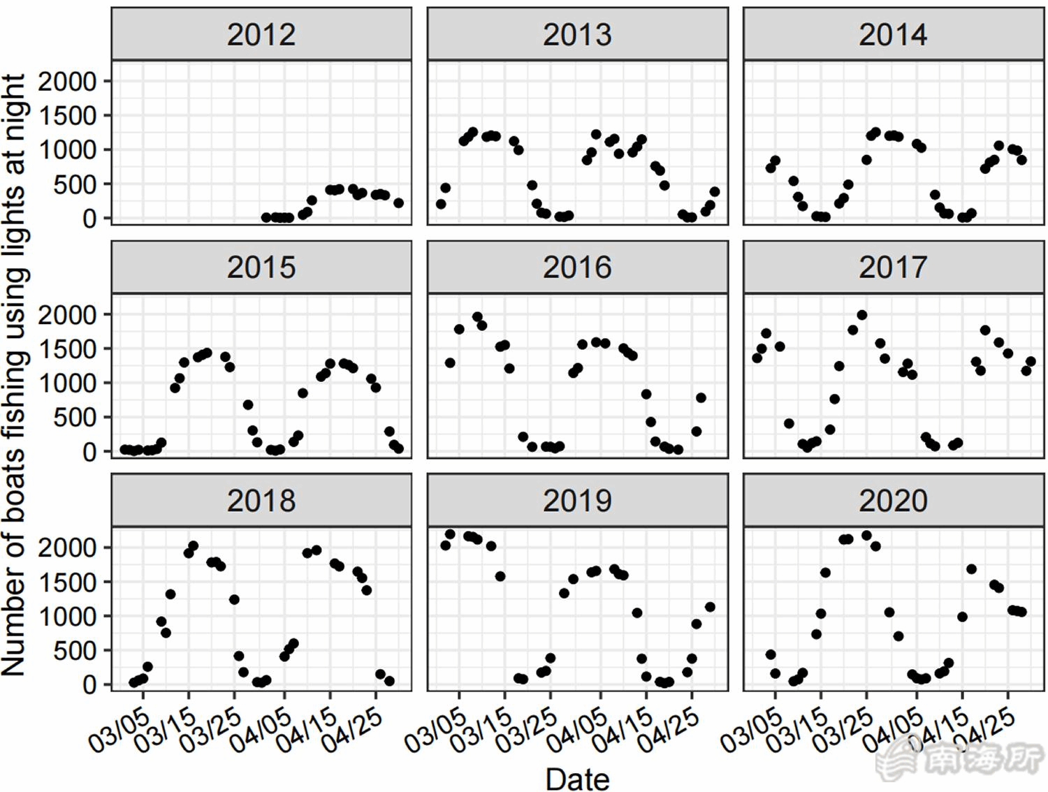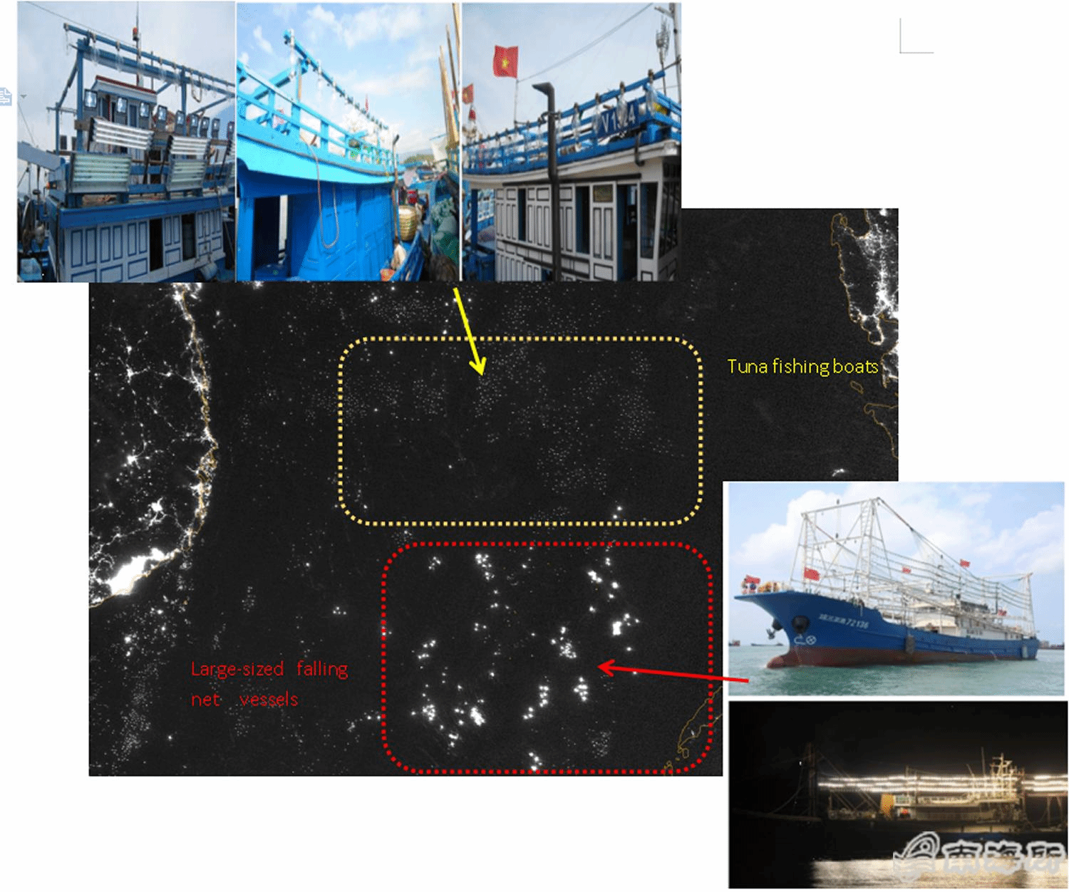 近年来,随着近海渔业的衰退,南海外海的中上层渔业资源受到越来越多的关注。灯光诱集作业因其高效性,目前已发展成为南海外海最主要的作业方式(大型灯光罩网渔船和小型金枪鱼灯光渔船)。然而,由于缺乏有效的渔船监测和分类手段,对南海外海灯光渔业发展变化的相关认识还非常匮乏?/p>