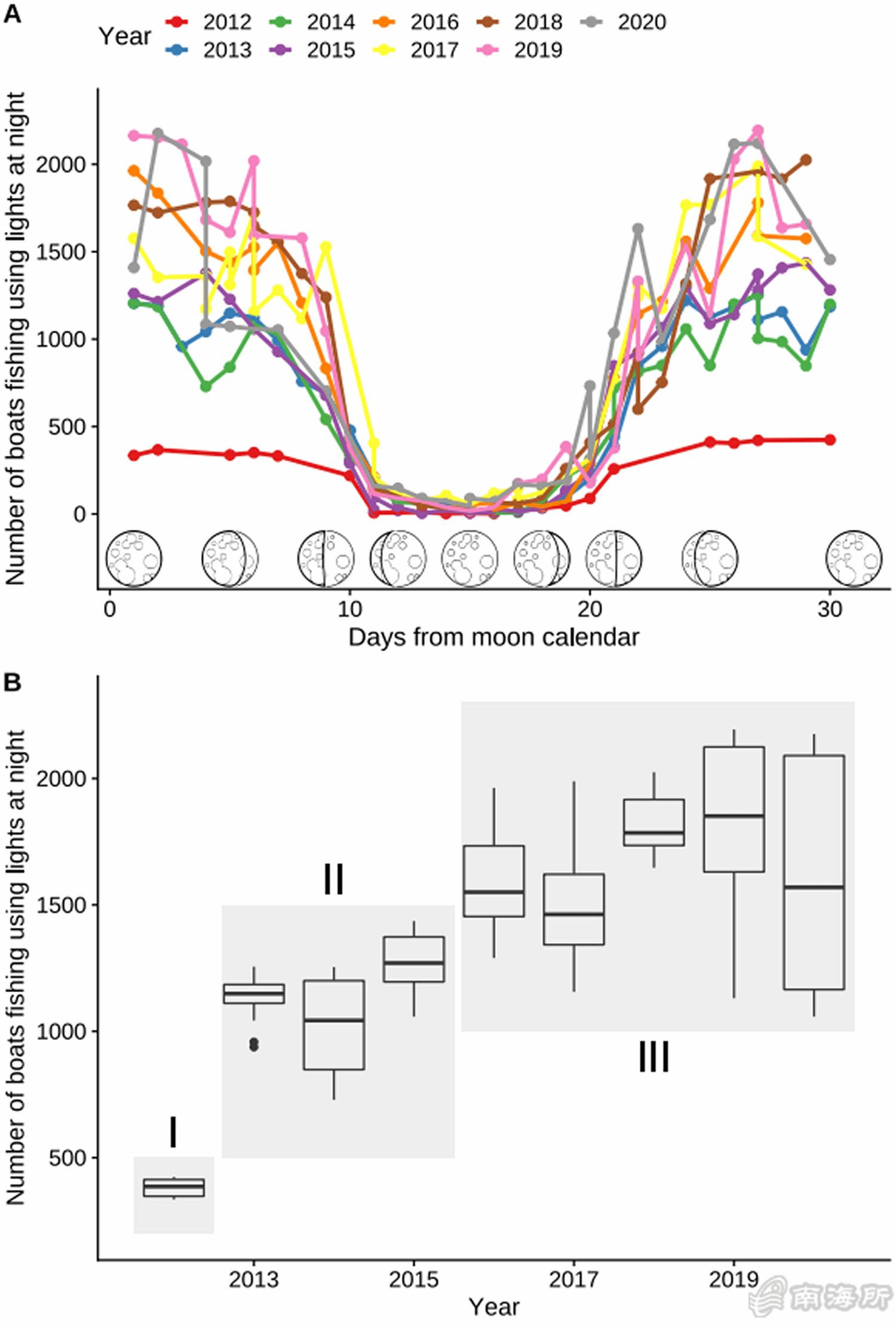灯光渔船数量与月相的关系(A),近十年非满月时期灯光渔船发展变化(B?/p>