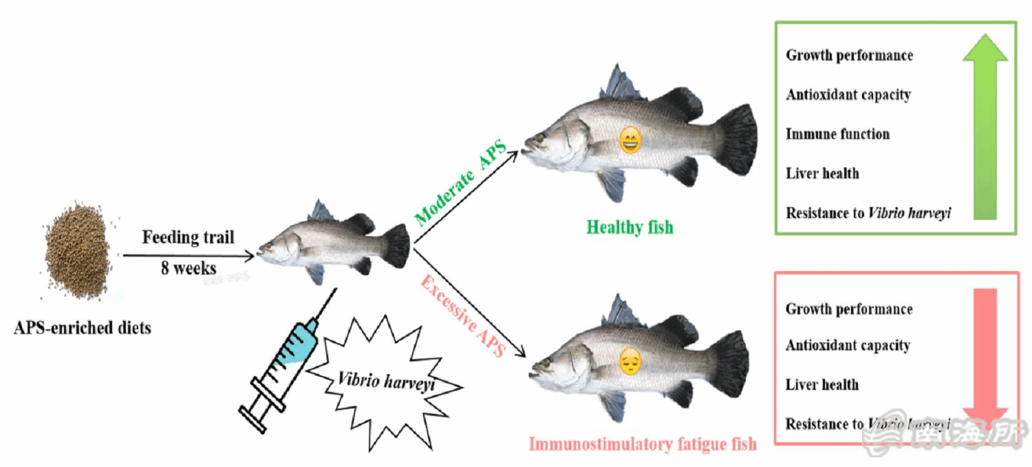 为探讨黄芪多糖对鱼类生长、免疫和抗应激的影响,南海所创新团队以尖吻鲈?em>Lates calcarifer)为研究对象,通过养殖实验和胁迫实验研究了五种黄芪多糖添加剂量的饲料(0, 0.05%, 0.10%, 0.15% ?0.20%)对尖吻鲈生长性能、健康水平和抗弧菌感染能力的影响。研究结果表明,添加0.10%的黄芪多糖,可以显著提高尖吻鲈生长性能,增强肠道蛋白酶和脂肪酶活性,有效降低肝脏炎症水平并提高肝脏抗氧化功能,显著提升哈维氏弧菌攻毒后的存活率;黄芪多糖的功能呈现显著的剂量效应,添?.20%剂量组的试验鱼生长性能显著低于0.10%剂量组,对鱼的肝脏有一定的致损效应,且导致试验鱼出现免疫疲劳状态?/p>