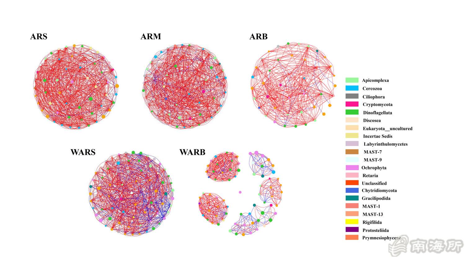 研究结果表明,大亚湾人工鱼礁生态系统原生生物群落结构主要受海水温度、盐度和溶解氧等环境因子的影响,这些生境因子增加了原生生物共生网络的空间异质性程度,导致生态位的显著分化,说明栖息地变化影响了原生生物共生网络的复杂性和稳定性;而防城港人工鱼礁生态系统内生物的相互作用和生境的差异是原生生物群落形成的关键因素,原生生物共生网络的关键拓扑特征参数表明人工生境自身所形成的原生生物群落物种间存在更多互利共生关系,具有更高的复杂性和稳定性,人工生境和邻近海水中关键类群不同,邻近海水原生生物群落功能偏向于海洋碳循环中碳的初步固定,高丰度的自养原生生物为礁体表面各类异养原生生物提供了充足的食物来源,也保证了关键类群发挥自身生态功能,通过捕食、排泄、降解,以及促进颗粒物的聚集和解聚等过程在生物碳泵中发挥着更为多重的生物效应?/p>