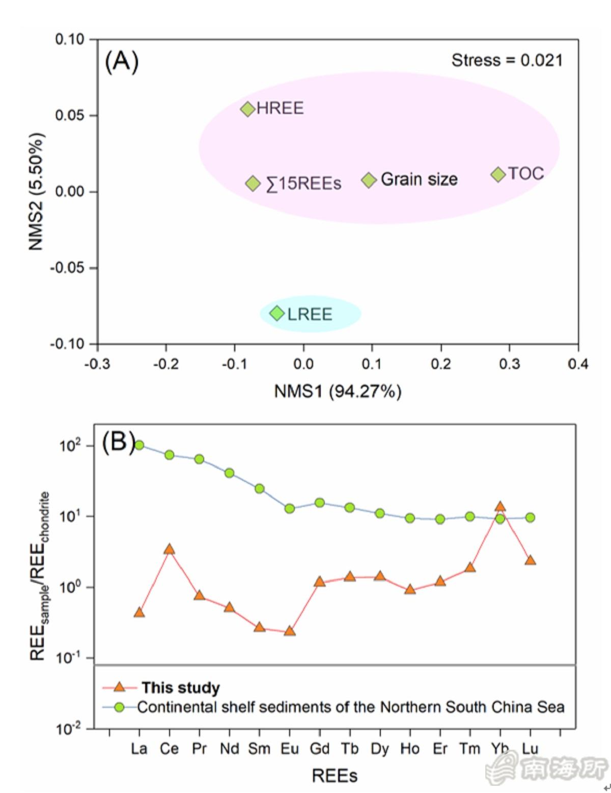 ? 大亚湾稀土元素非度量多维尺度分析(NMS)特征(A)与球粒陨石标准化分布特征(B?/p>