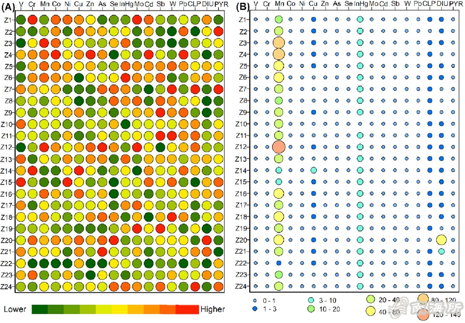 2.柘林湾重金属和杀虫剂DGT含量分布(A)和单因子生态风险熵(B?/p>