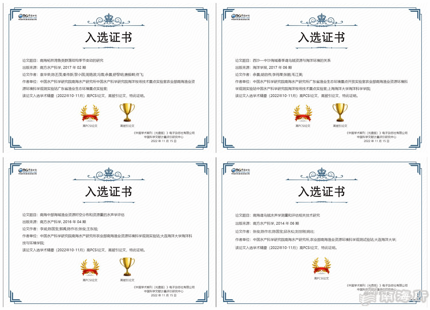 该团队副首席专家袁华荣助理研究员以第1作者发表于《南方水产科学》的论文《南海柘林湾鱼类群落结构季节变动的研究》,团队专业带头人余景研究员以第1作者发表于《海洋学报》的论文《西沙—中沙海域春季鸢乌贼资源与海洋环境的关系》,团队专业带头人陈国宝研究员以通讯作者发表于《南方水产科学》的论文《南海中部海域渔业资源时空分布和资源量的水声学评估》和以通讯作者发表于《南方水产科学》的论文《南海鸢乌贼水声学测量和评估相关技术研究》,均同时荣获“高PCSI论文、高被引论文”?/p>