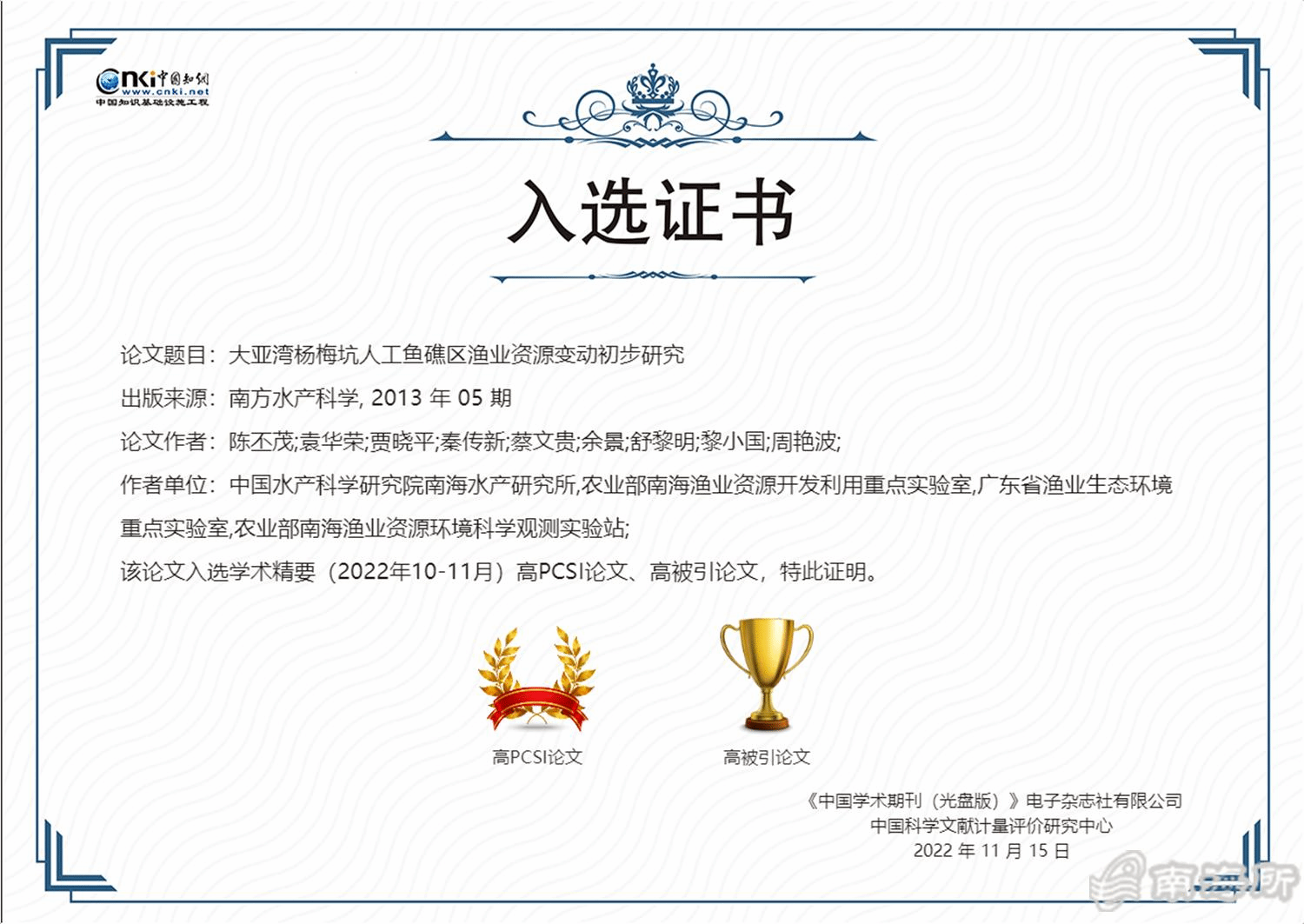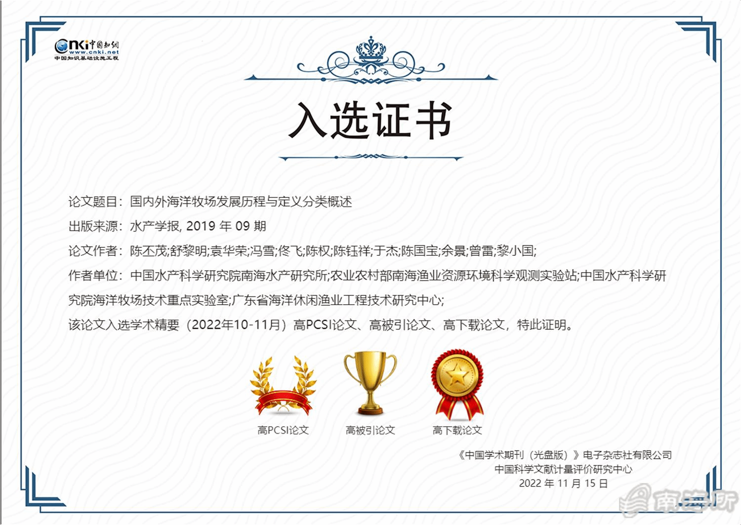 该创新团队首席专家陈丕茂研究员以?作者发表于《水产学报》的论文《国内外海洋牧场发展历程与定义分类概述》同时荣获“高PCSI论文、高被引论文、高下载论文”;以第1作者发表于《南方水产科学》的论文《大亚湾杨梅坑人工鱼礁区渔业资源变动初步研究》同时荣获“高PCSI论文、高被引论文”?/p>