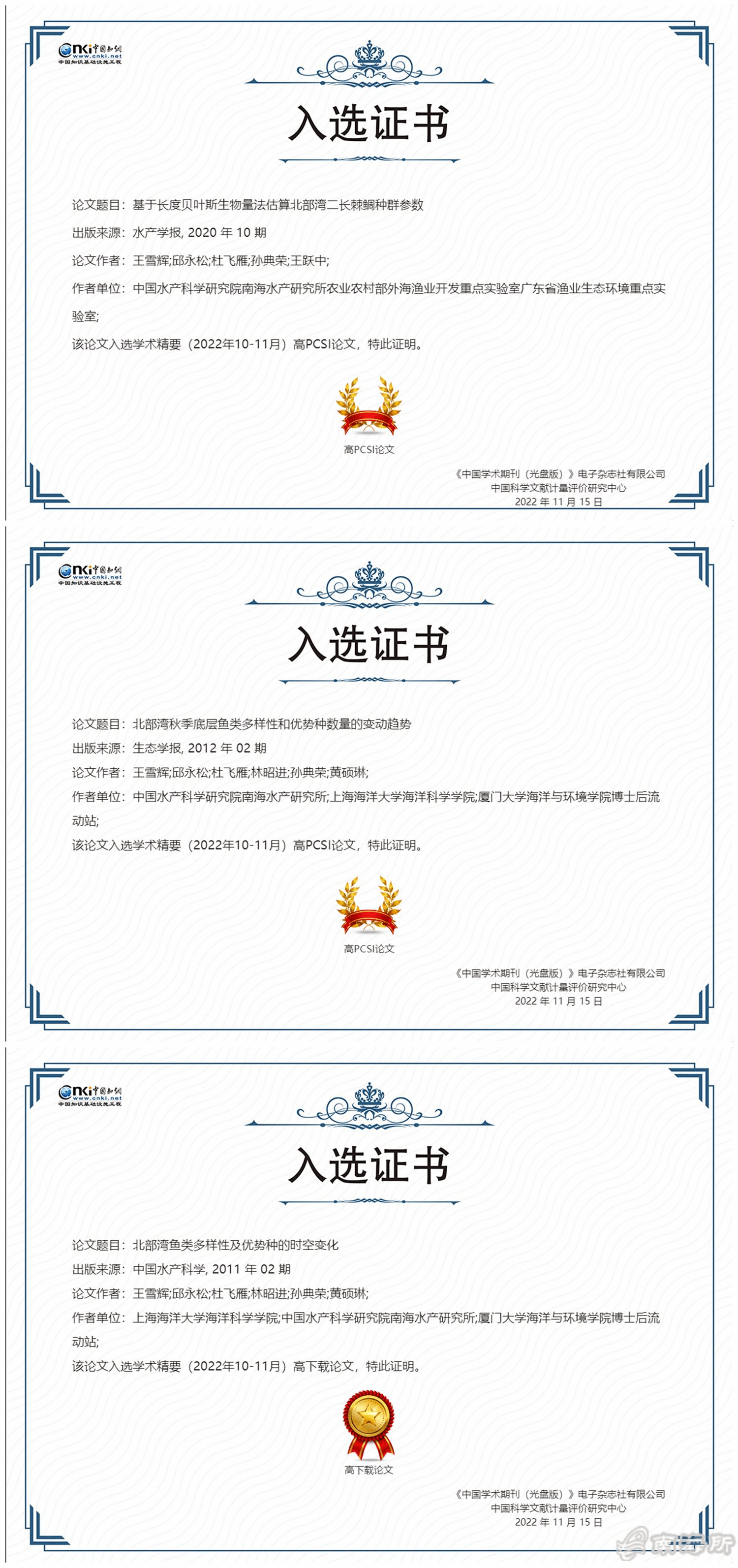 团队专业带头人王雪辉特聘研究员以?作者发表于《水产学报》的论文《基于长度贝叶斯生物量法估算北部湾二长棘鲷种群参数》和以第1作者发表于《生态学报》的论文《北部湾秋季底层鱼类多样性和优势种数量的变动趋势》荣获“高PCSI论文”,以第1作者发表于《中国水产科学》的论文《北部湾鱼类多样性及优势种的时空变化》荣获“高下载论文”?/p>