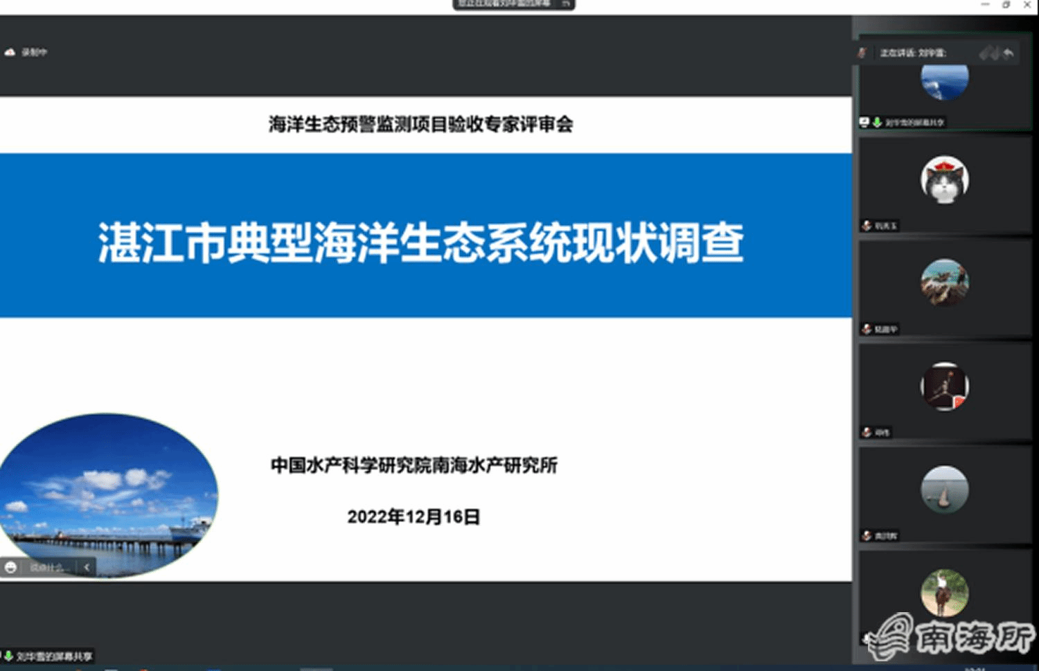 2022?2?6日,中国水产科学研究院南海水产研究所以线上形式组织召开“湛江市典型海洋生态系统现状调查”项目结题验收会。该项目是广东省自然资源厅首批海洋生态预警监测项目,由南海所黄洪辉研究员和刘华雪副研究员任项目负责人,联合中国科学院南海海洋研究所、国家海洋局南海环境监测中心、中国林业科学研究院热带林业研究所、广东海洋大学共同完成。广东省地质环境监测总站、中山大学、广东省生态环境监测中心、广东省海洋发展规划研究中心等单位有关领导和专家出席验收会?nbsp;