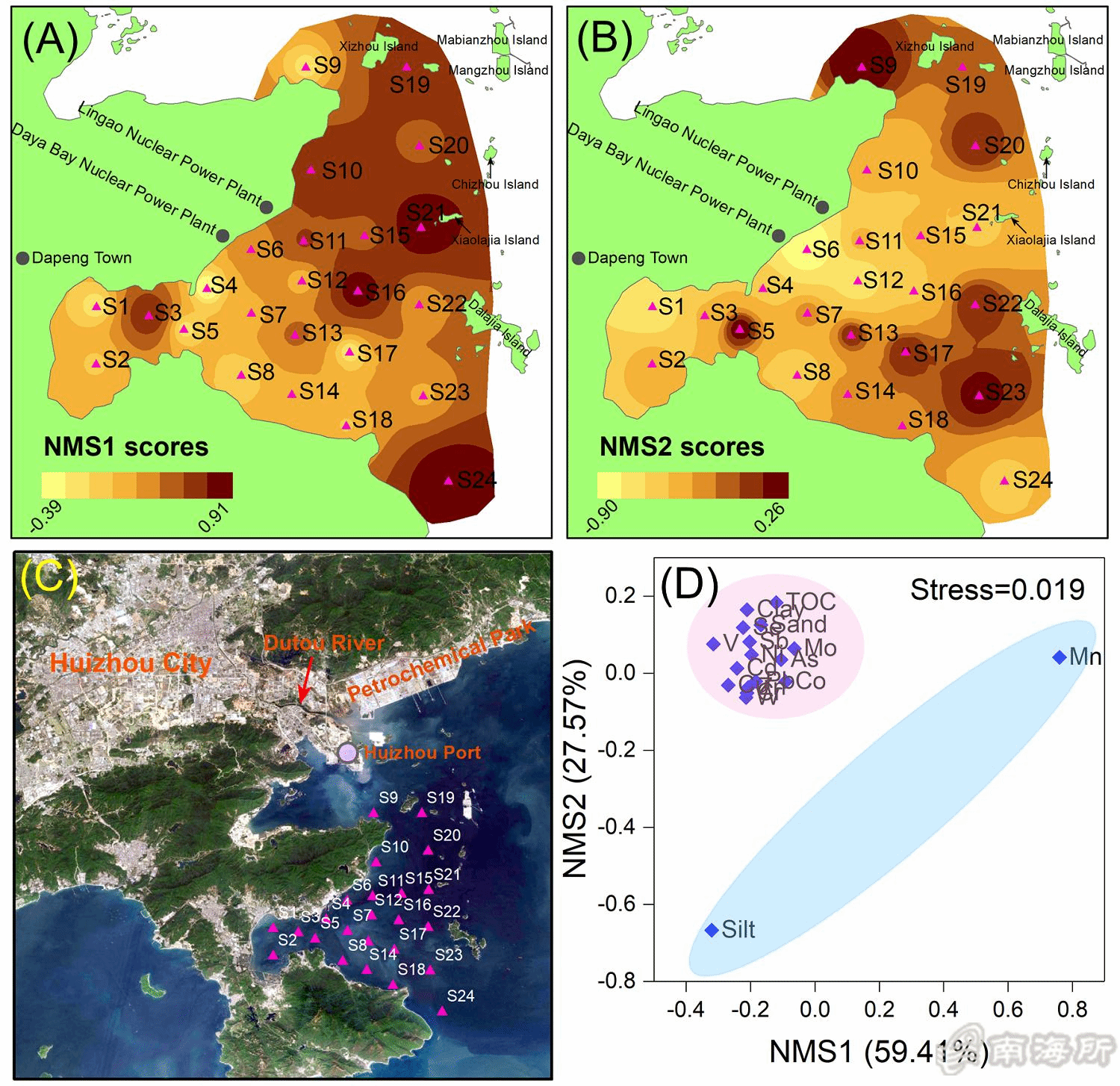 南海所创新团队以大亚湾水域为研究对象,采用非度量多维尺度分析(NMDS)研究了沉积物理化特征对微量金属元素生物可利用的影响;采用该团队前期已经成功构建的多种污染物对水生生物区系联合生态风险评价方法(Water Research, 2020, 185: 116254; Water Research, 2022, 224: 119108),对大亚湾沉积物中多种微量金属元素的联合生态风险进行了评价。通过NMDS研究表明,大亚湾沉积物中的大部分微量金属元素生物可利用性受到沉积物理化特征影响;大亚湾沉积物中微量金属元素对水生生物区系联合生态风险概率为9.04%?/p>