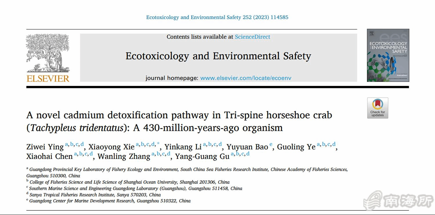 近日,中国水产科学研究院南海水产研究所中华鲎保护研究团队在利用转录组与代谢组技术分析镉暴露下中华鲎幼鲎的解毒机制研究方面取得新进展,研究成果以“A novel cadmium detoxification pathway in Tri-spine horseshoe crab (Tachypleus tridentatus):A 430-million-years-ago organism”为题发表于Ecotoxicology and Environmental Safety (IF 7.129)(应紫薇为第一作者,颉晓勇博士为通讯作者),为中华鲎栖息地环境评估和增殖放流地点选择方面提供了理论依据,还为后续中华鲎重金属胁迫研究提出了新思路?nbsp;