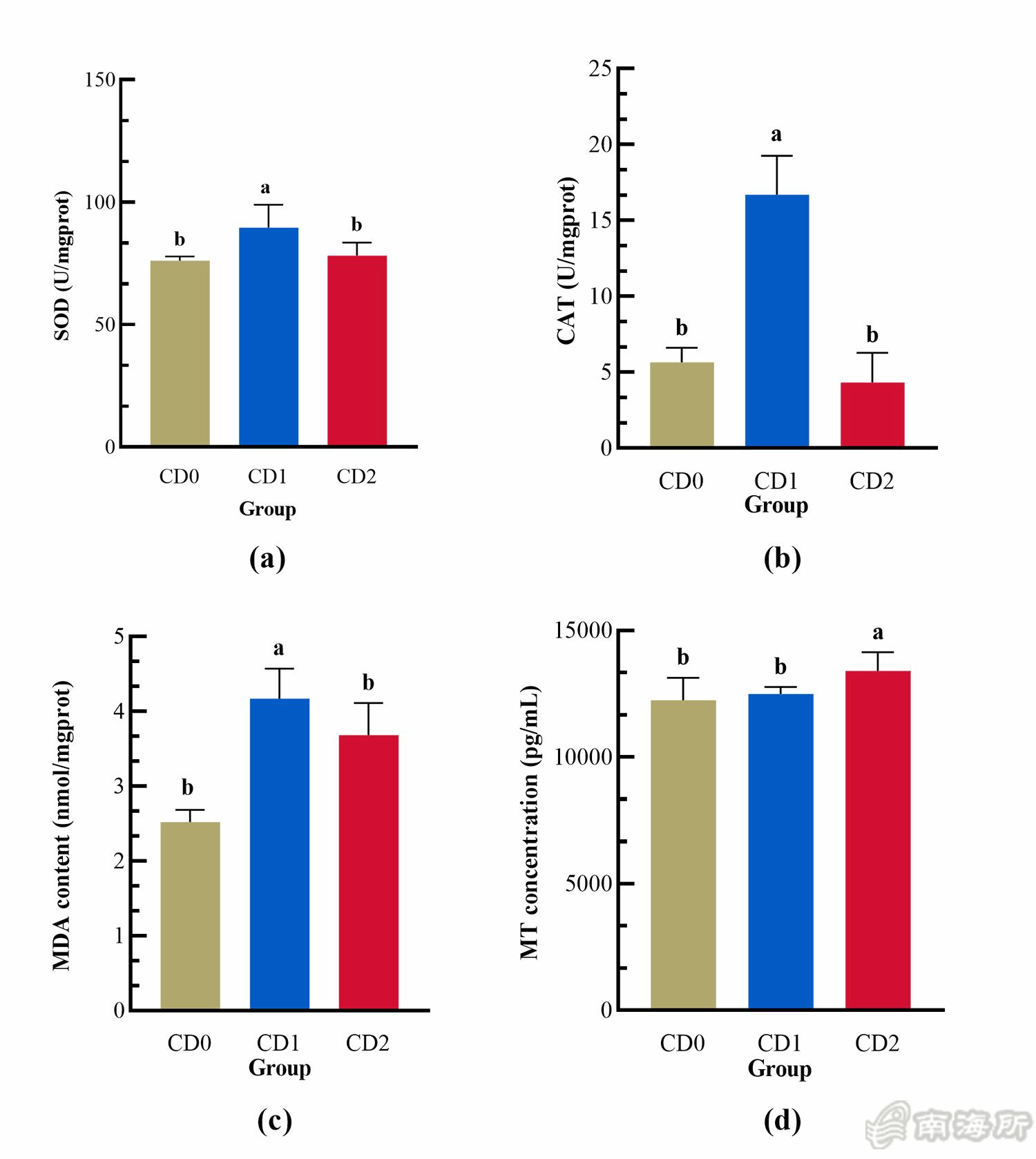 ?)抗氧化指标SOD、CAT、MDA、MT的测定结果显示:镉胁迫会造成幼鲎氧化应激反应,且随镉浓度升高,对幼鲎危害也随之加剧?/p>
