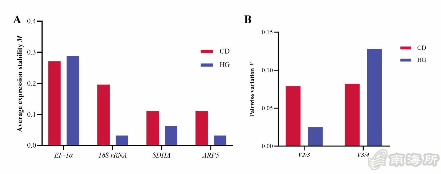 使用geNorm软件计算潜在内参基因平均表达稳定值M (A)和成对变化值V (B)