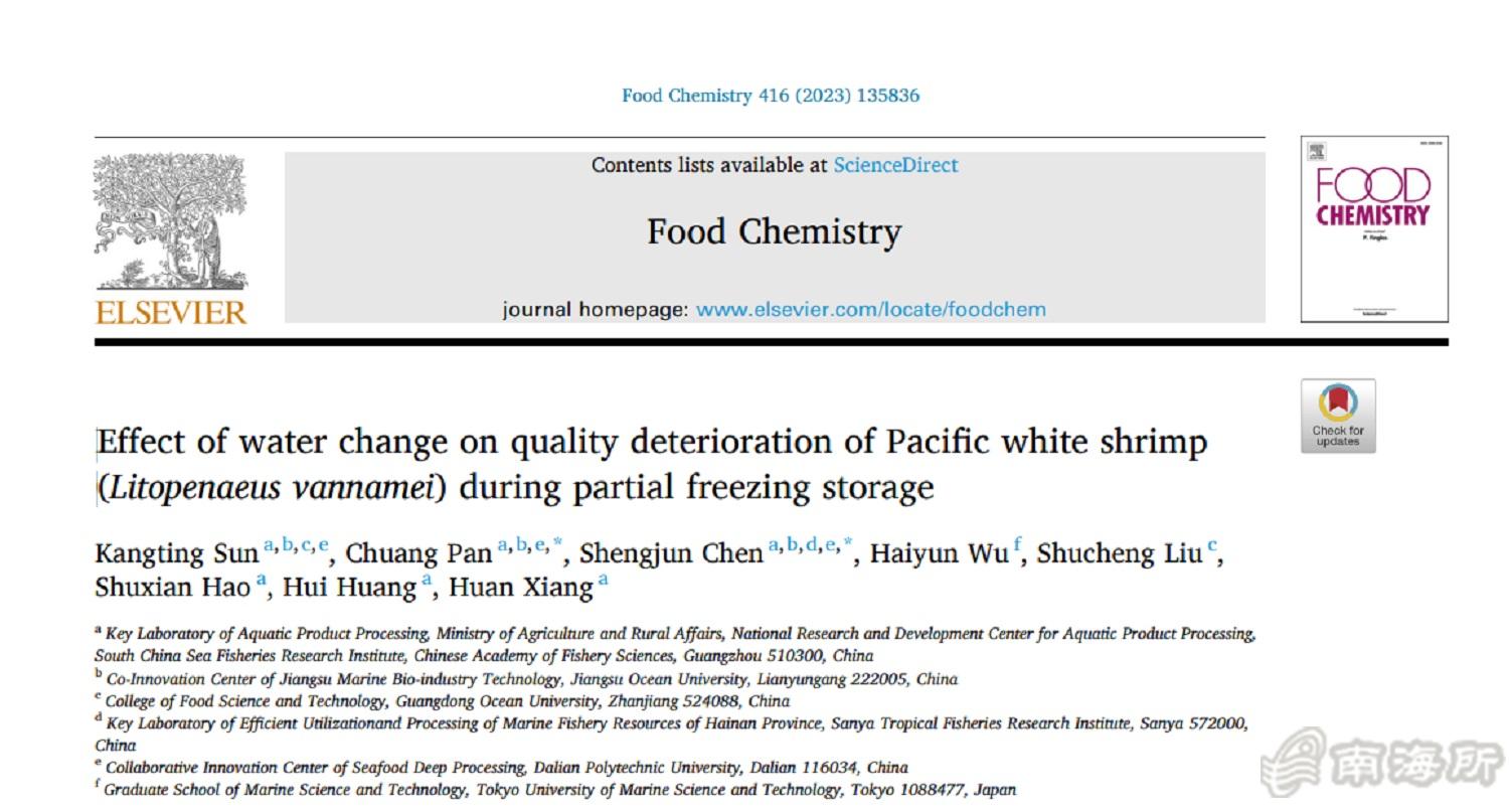近日,中国水产科学研究院南海水产研究所食品工程与质量安全研究室在微冻凡纳滨对虾贮藏期间水分变化对品质劣化的影响研究方面取得新进展。研究团队通过定量冰晶特性建立阿伦尼乌斯预测模型,测定水分的变化,探索微冻贮藏期间对虾肌肉品质劣化程度,构建了水分变化与品质劣化之间的相关性。相关研究成果以?span style="font-family: "times new roman";">Effect of water change on quality deterioration of Pacific white shrimp (Litopenaeus vannamei) during partial freezing storage”为题发表于Food Chemistry (IF 9.231)(孙康婷为第一作者,潘创博士、陈胜军博士为共同通讯作者)?/p>