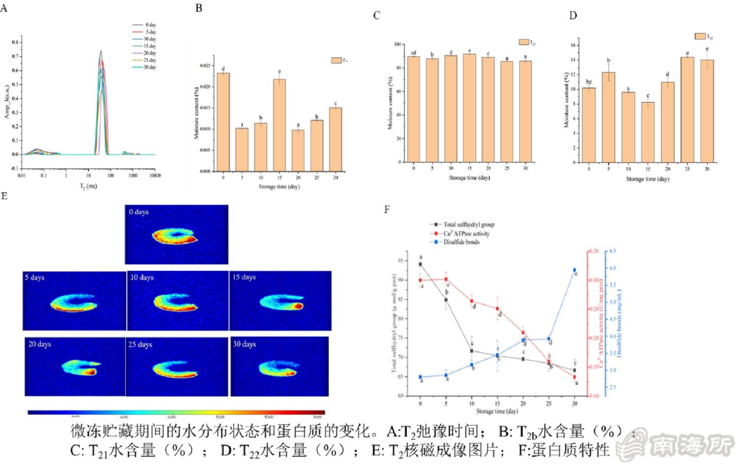 ?)利用低场核磁共振和核磁成像检测技术测定凡纳滨对虾的肌肉水分分布情况。自由水(T22)贮藏后期增加,固定水(T2b)和结合水(T21)呈现显著下降。核磁成像结果显示,H质子密度随着贮藏时间的增加而降低,水的分布位置也发生了变化。在蛋白质特性指标中,随着贮藏时间的延长,总巯基含量显著降低,因为巯基氧化成为二硫键,二硫键含量显著升高。Ca2+-ATPase活性随贮藏时间的增加而显著降低?/p>