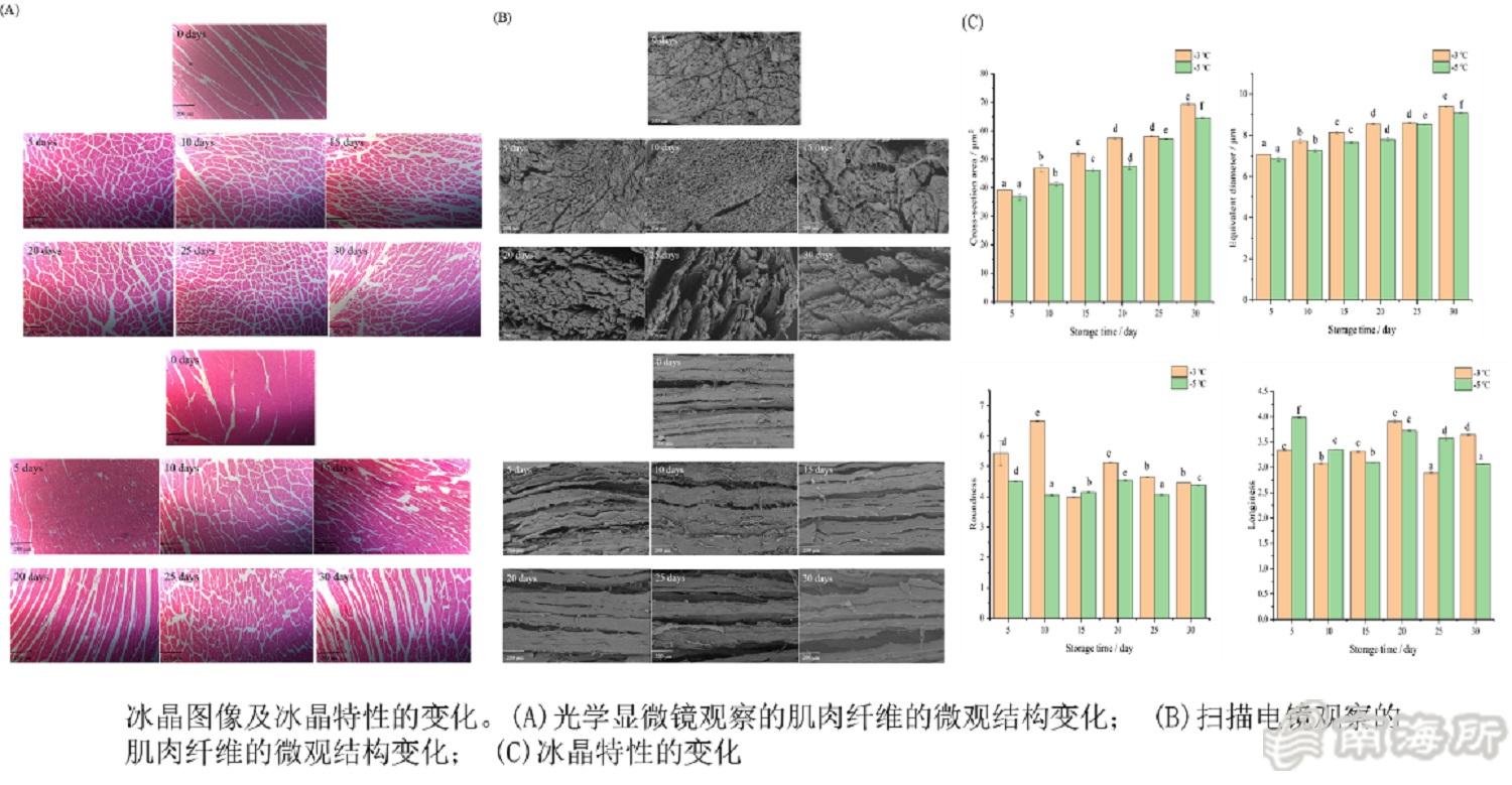 凡纳滨对虾营养丰富,味道鲜美且年产量大,2021年海水养殖产量高?27.31万吨。微冻是一种在短期内保持凡纳滨对虾品质的较好方法。然而微冻贮藏过程中水分发生部分冻结,产生的冰晶对肌肉组织的影响不规律。开展水产品在微冻贮藏过程中冰晶对肌肉品质变化的研究对改善产品品质意义重大,为此,南海所研究团队开展了微冻贮藏对虾水分变化与品质劣化的关系研究?/p>