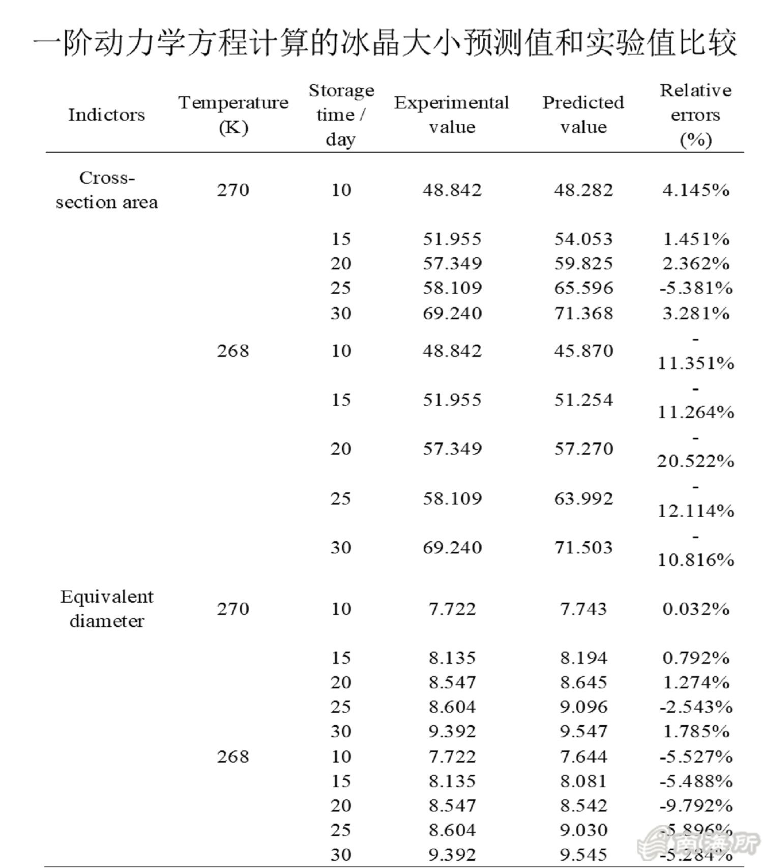?)借助Arrhenius模型,选用冰晶横截面积和当量直径建立冰晶生长的一阶动力学预测模型?70 K?3 ℃)的截面积和当量直径相对误差在10%以内,可以快速计算对虾微冻贮藏过程中冰晶的大小?/p>