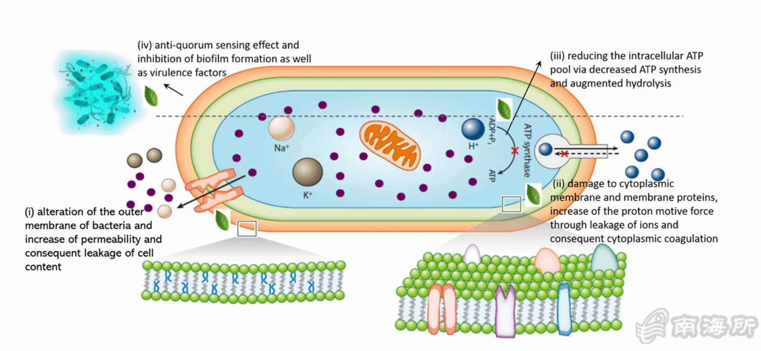 ?:精油对细菌?/span>胞的作用机制和作用位点(摘自郑晓婷等的综述论文:Zheng X T. and Bossier P, Toxicity assessment and anti‐Vibrio activity of essential oils: Potential for application in shrimp aquaculture. Reviews in Aquaculture, 2023. doi:10.1111/raq.12795)?/span>