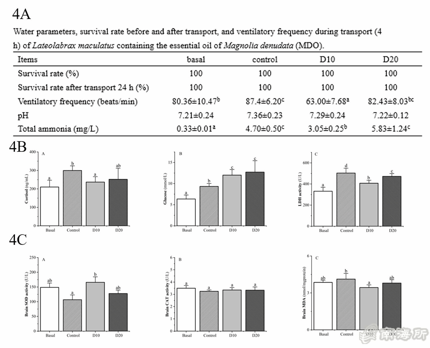 ?A:添加白玉兰精油镇静降低了中国花鲈运输过程的呼吸频率,运输后的氨氮浓度。图4B:添加白玉兰精油运输后缓解了中国花鲈血清学应激指标(皮质醇,血糖,乳酸脱氢酶)的上升。图4C:添加白玉兰精油运输后中国花鲈缓解了脑抗氧化指标(SOD,CAT,MDA)的下调(摘自曾祥兵等的研究论文:Zeng, X, Dong, H, Yang, Y, Li, T, LI, C, Zhang, J, 2022 Effects of essential oil of Magnolia denudata on spotted seabass (Lateolabrax maculatus) during simulated live transportation. Aquaculture, 739258.)?/span>