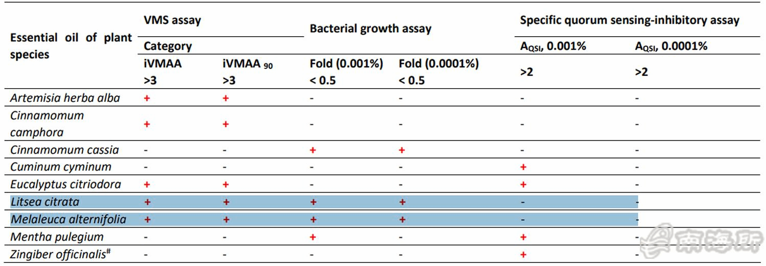 ?:采用OD值法、气相扩散法和生物发光检测法,筛选出体外能抑制发光坎氏弧菌能力的植物精油。结果显示山苍籽精油?em>Litsea citrata)和茶树精油?em>Melaleuca alternifolia)具有抑制发光坎氏弧菌生长的能力(摘自郑晓婷等的研究论文:Zheng X T, Feyaerts A F, Van Dijck P, Bossier P. Inhibitory activity of essential oils against Vibrio campbellii and Vibrio parahaemolyticus. Microorganisms, 2020,8(12):1946)?/span>