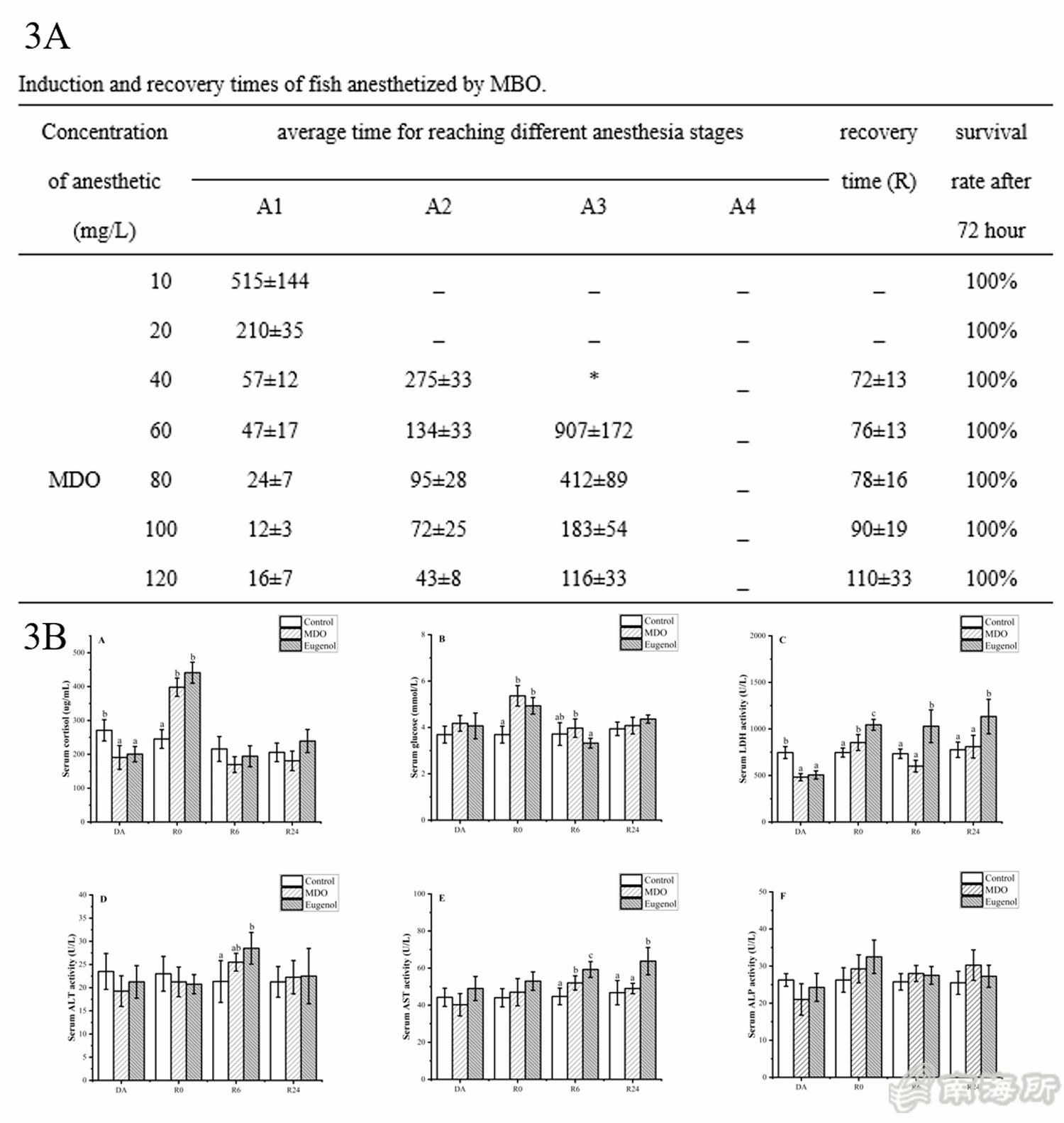 ?A:白玉兰精油对中国花鲈麻醉效果评估,基于A3阶段<180 s的时间标准,白玉兰精油的最低麻醉有效浓度为100 mg/L。图3B:在应激阶段,白玉兰精油有效缓解了相关应激指标的上升,且在恢复阶段,白玉兰精油组的肝损伤指标较丁香酚低(摘自曾祥兵等的研究论文:Zeng, X, Dong, H, Wu, J, Wang, W, Duan, Y, Chen, J, Zhang, J, 2022. Essential oil of Magnolia denudata is an effective anesthetic for spotted seabass (Lateolabrax maculatus): a test for its effect on blood biochemistry, physiology and gill morphology. Fish physiology and biochemistry 48, 1349?363, 2022.)?/span>
