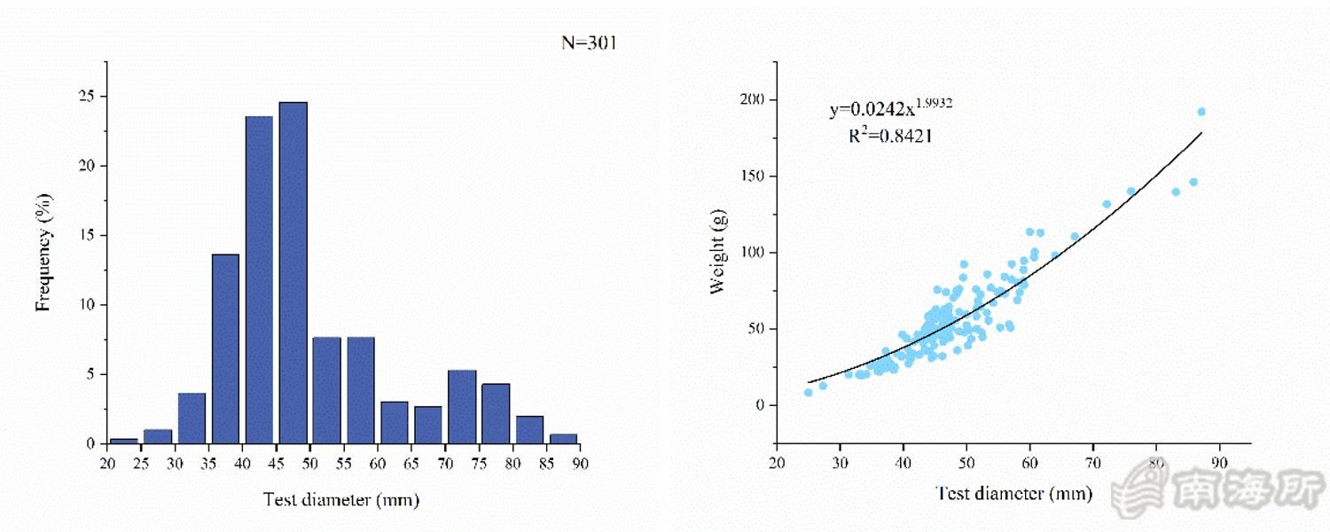 大亚湾以其良好的栖息环境和丰富的饵料资源成为紫海胆的一个重要栖息海域。南海所创新团队以大亚湾海域紫海胆为研究对象,围绕其种群结构、生殖周期及影响因子开展系统研究。研究结果表明,紫海胆种群结构和种群规格的分布受季节变化和捕捞压力的影响,种群生长呈现异速生长模式,长度-重量方程为:W=0.0242L1.993 (R2=0.8421);其性腺发育过程可分为恢复期、生长期、成熟前期、成熟期和排放后期,雌雄配子几乎同步发育;紫海胆的产卵期?月至11月,较温带紫海胆产卵周期长,存在4月和8月两个产卵高峰期,产卵时间受温度和饵料的影响?/p>