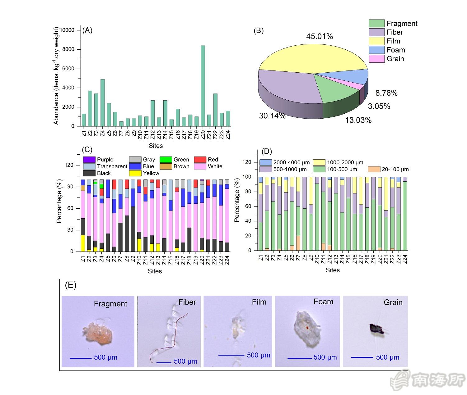 ?. 柘林湾沉积物中微塑料丰度(A)、形状(B)、颜色比例(C)、尺寸(D)以及形态学特征(E?/span>