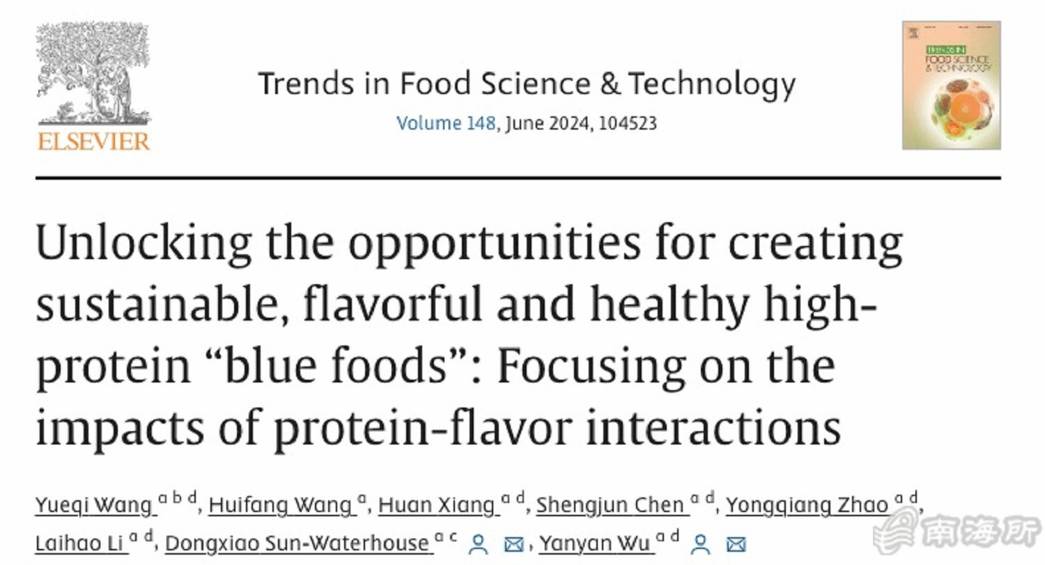 2024??日,中国水产科学研究院南海水产研究所院级水产品精深加工与高值化利用创新团队王悦齐、吴燕燕与奥克兰大学Dongxiao Sun-Waterhouse教授在国际食品Top期刊《Trends in Food Science & Technology?Q1,IF=15.3)正式发表题为“Unlocking the opportunities for creating sustainable, flavorful and healthy high-protein “blue foods? Focusing on the impacts of protein-flavor interactions”的综述性论文。该论文第一作者为王悦齐副研究员,通讯作者为吴燕燕研究员和Dongxiao Sun-Waterhouse教授?/p>