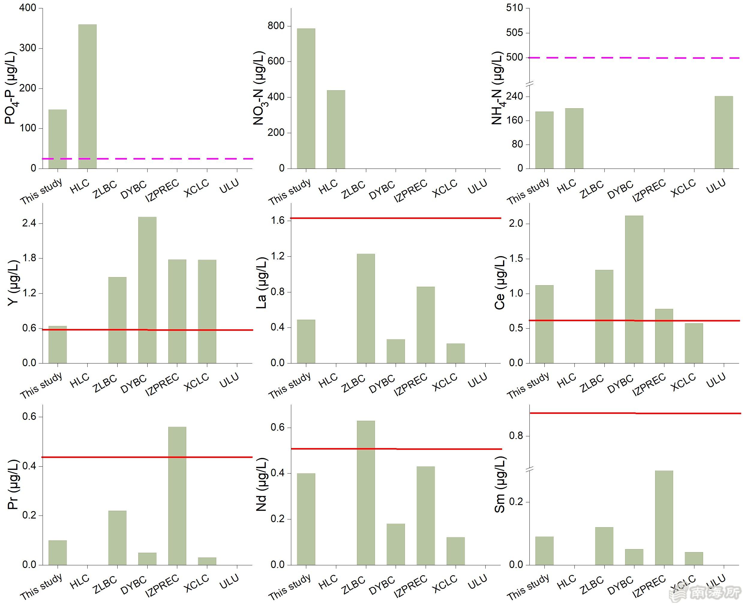 ?/span>2. 洪泽湖表层沉积物中营养盐?/span>REEs?/span>DGT浓度及其与相关标准和地区的比较?/span>PNEC:预测无影响浓度?/span>CNSEQSW (?/span>):我国地表水环境质量国家标准?/span>GB 383-2002)的二级标准;二级标准(Ⅱ)主要适用于集中式生活饮用水地表水源一级保护区、珍稀水生生物栖息地、鱼虾产卵场和鱼苗、幼鱼的饵料区等?/span>HLC:呼伦湖?/span>ZLBC:柘林湾?/span>DYBC:大亚湾?/span>IZPREC:珠江口潮间带?/span>XCLC:新村湾?/span>ULU:美国的犹他湖。本研究中所提及?/span>ULU浓度是指水体中的浓度,而不是使?/span>DGT技术测量的沉积物中的浓度?/span>
