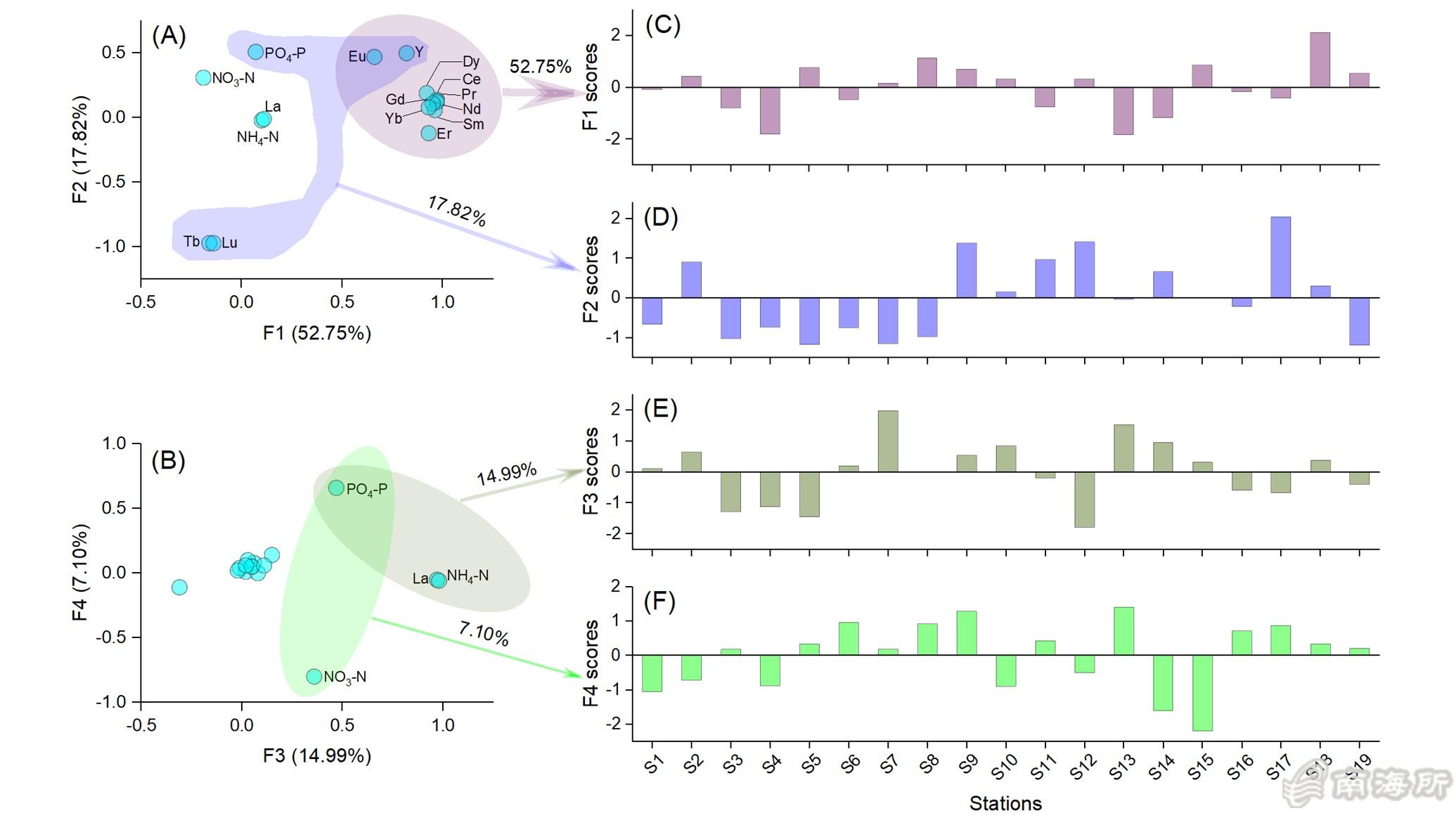 ?/span>4. 洪泽湖表层沉积物中营养盐?/span>REEs因子载荷分布图(A?/span>B)及每个站点?/span>F1?/span>F2?/span>F3?/span>F4因子得分?/span>C?/span>D?/span>E?/span>F)?/span>