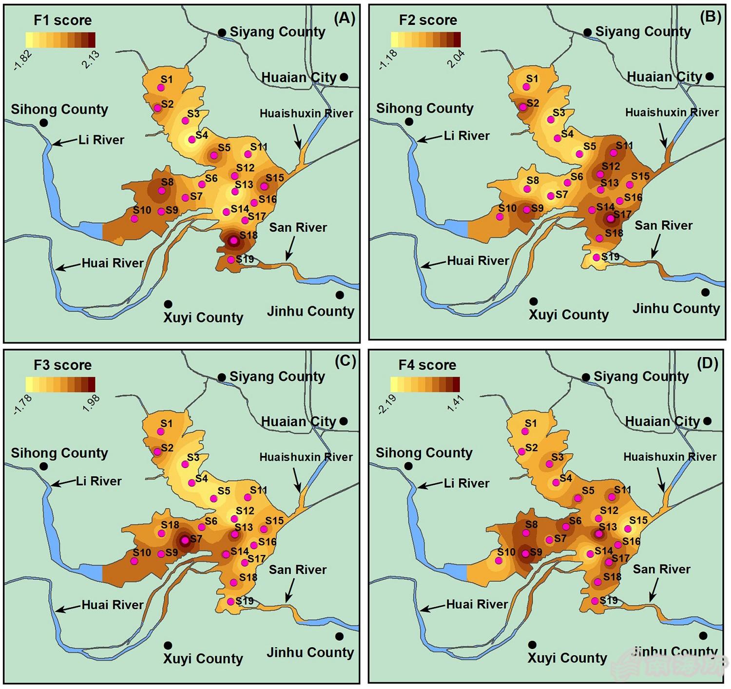 ?/span>5. 基于地理信息系统?/span>GIS)中的反距离权重?/span>IDW)技术,洪泽湖表层沉积物?/span>F1?/span>F2?/span>F3?/span>F4得分的空间分布图?/span>