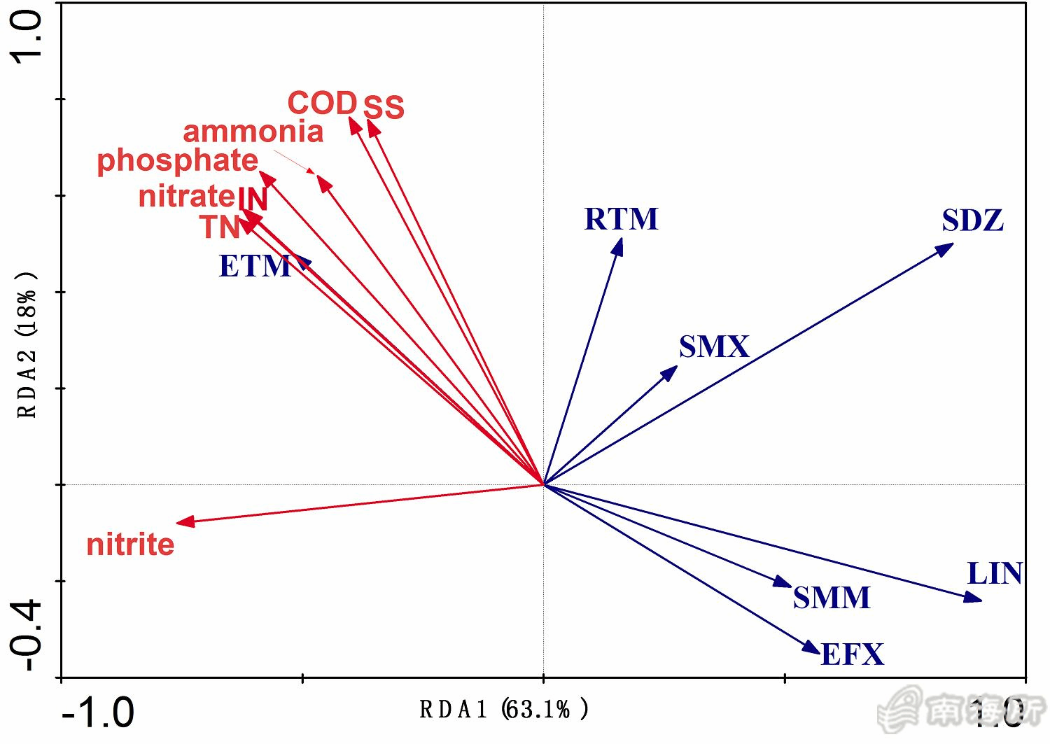 生物絮团零换水养殖系统中抗生素与环境因子的RDA分析