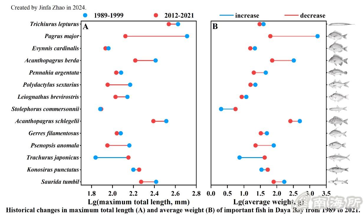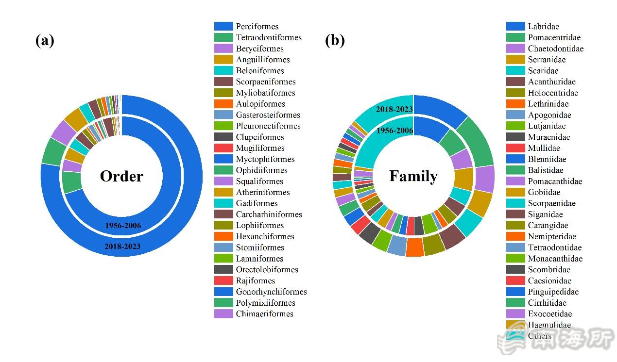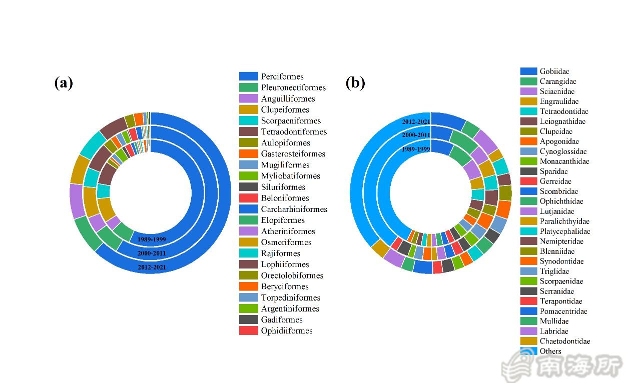 南海所创新团队以近岸岛礁大亚湾中央列岛为例,通过汇总分析近30余年?989-2021年)的渔业资源历史数据和补充调查数据,评估了鱼类物种组成、群落结构、食性、体型和重要物种的长期变化特征。大亚湾中央列岛水域共有鱼类记录544种,?0多年鱼类群落结构具有明显的演替特征,主要表现为:(1)大型鱼类的种类和生物量明显减少,鱼体小型化;(2)目和科的物种数量明显下降,分类多样性下降;(3)不同时期鱼类相似性较低,优势物种变化明显。该研究还深入探讨了大亚湾中央列岛鱼类群落结构演替的其它驱动因素,为保护大亚湾中央列岛水域渔业生态系统及服务功能提供了依据支持?/p>