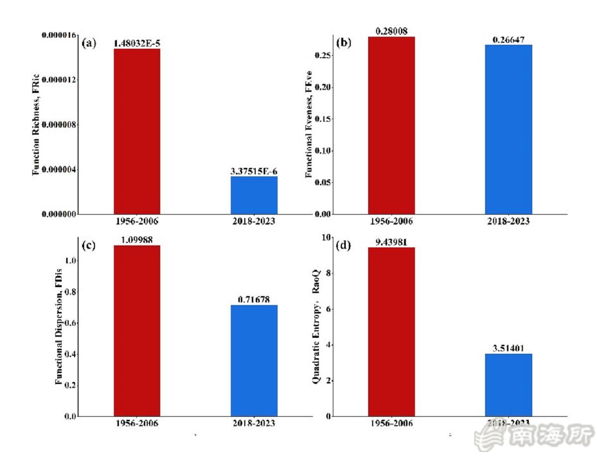 以离岸岛礁西沙群岛为例,采用水下潜捕、流刺网、手钓、延绳钓、水下摄影和eDNA等多种方法开展补充调查,并结合近70年(1956-2023)历史数据,综合探讨了西沙群岛珊瑚礁鱼类的演变特征。当前在西沙群岛海域共记录了874种珊瑚礁鱼类,鱼类群落结构发生显著变化,呈现如下特征?1)大型鱼类和肉食性鱼类数量明显减少;(2)目、科和属的数量也明显减少,平均分类差异指数(Delta+)、变异分类差异指数(Lambda+)、功能丰富指数(FRic)和功能多样性指数(RaoQ)均有明显下降;(3)不同时期鱼类间的相似度较低,多为不相似或中等相似。在不同功能群中,大型鱼类和肉食性鱼类的相似度最低,而植食性鱼类的相似度最高。近70年以来,西沙群岛珊瑚礁鱼类的种类组成呈现出肉食性向植食性、大型鱼向小型鱼、以及种类组成和功能的复杂性向简单性的演变趋势。该研究对西沙珊瑚礁生态系统的渔业栖息地保护与渔业资源养护具有重要参考价值?/p>