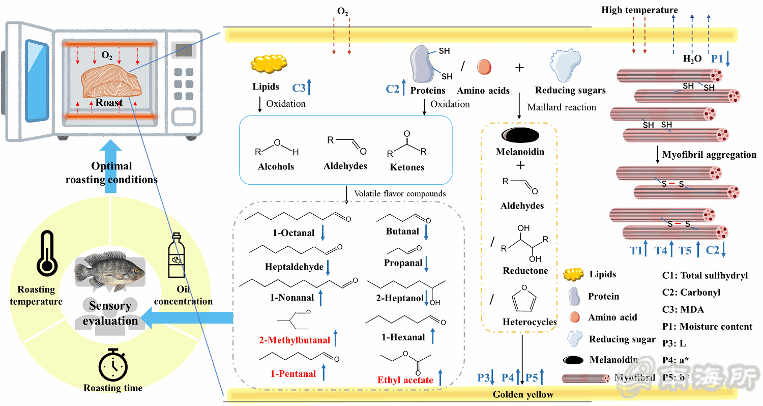 近期,中国水产科学研究院南海水产研究所院级水产品精深加工与高值化利用创新团队在烤罗非鱼品质优化和感官形成机制研究方面取得新进展,相关研究成果以“Identification of key physicochemical properties and volatile flavor compounds for the sensory formation of roasted tilapia”为题发表在国际期刊《Food Chemistry》(JCR 1区,IF=8.5,联合培养硕士研究生陈天玉为第一作者,李春生副研究员和陈胜军研究员为通讯作者)?/span>