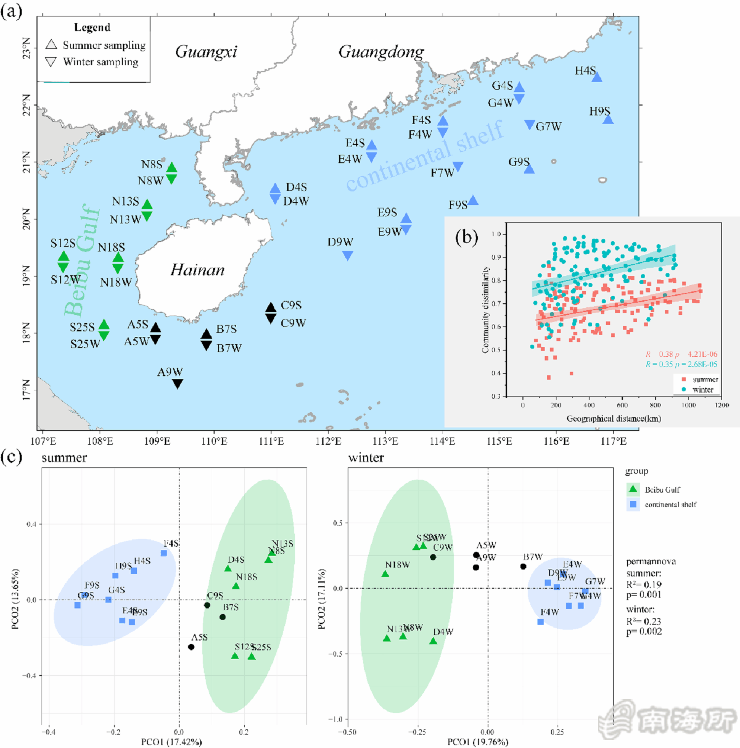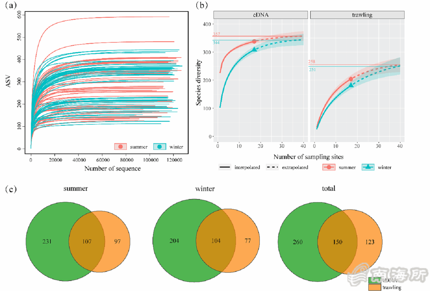 通过eDNA方法分别在夏季和冬季检测到338种和308种鱼类。eDNA鉴定的物种分别占夏季、冬季和总体底拖网检测到的物种的52.2%?7.1%?4.9%(图2)。群落结构差异与地理距离有较强的相关性,北部湾与东部大陆架区的鱼类群落呈现出显著差异(图1)?/p>